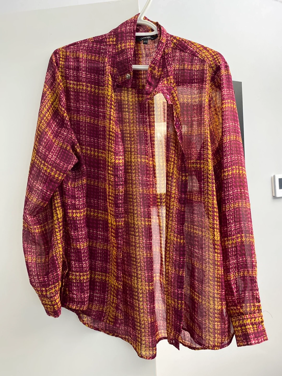 This is a George women's sheer long-sleeve button-up shirt. It features a plaid pattern in maroon and yellow. The material is lightweight and translucent. Size is XL.