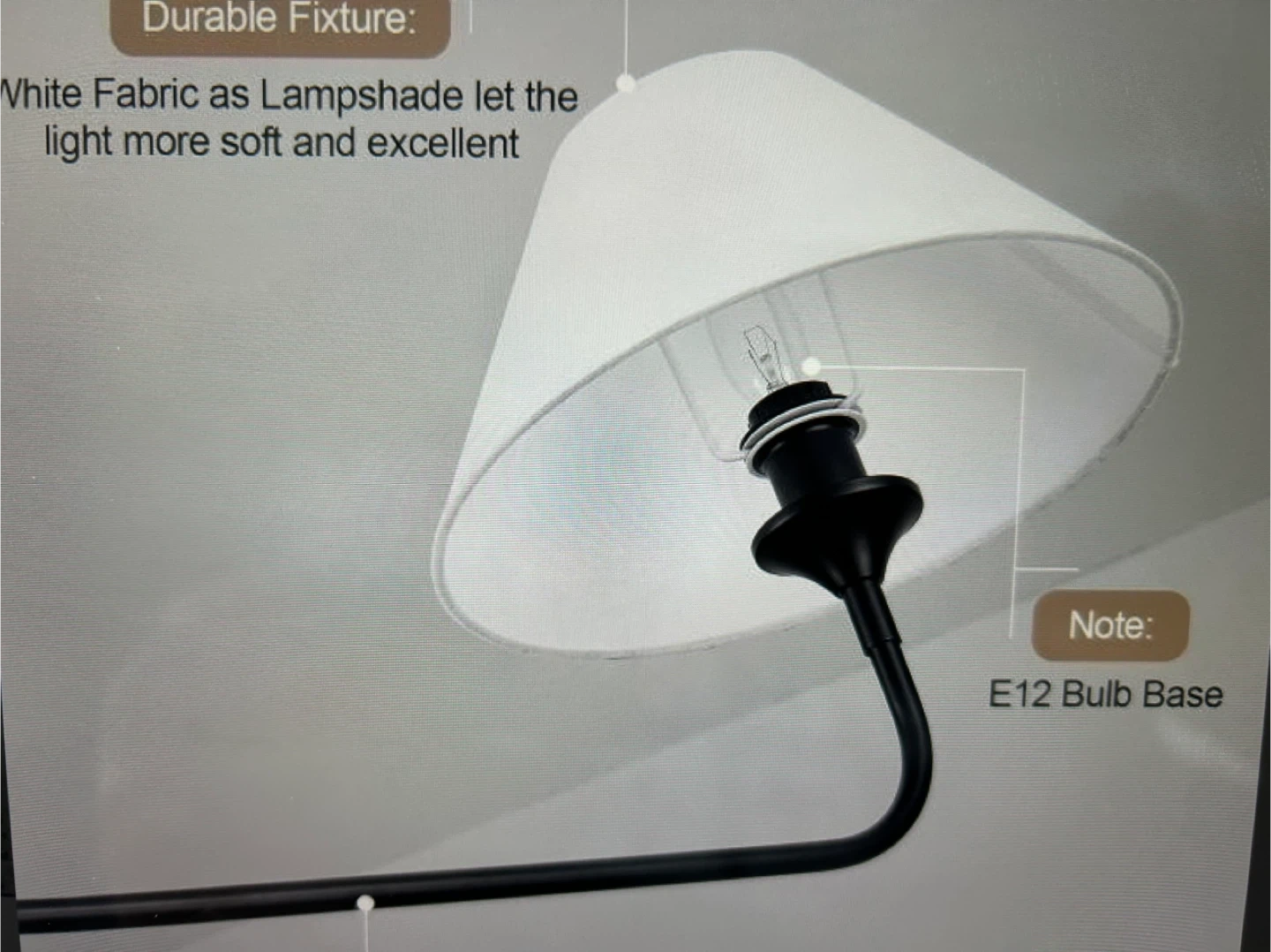This black chandelier features two white fabric lampshades that diffuse light softly. It's designed with an E12 bulb base. The fixture comes with an instruction manual for assembly.