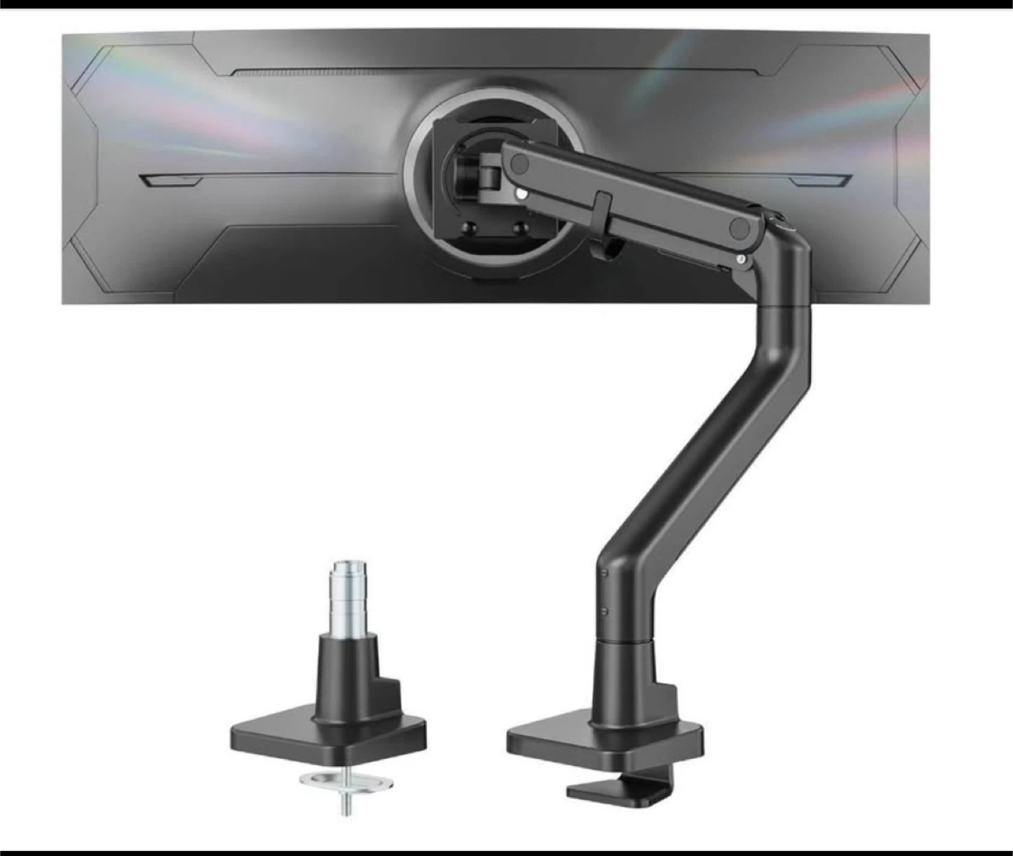 65Heavy-Duty Ultrawide Monitor Arm – Up to 57” / 59.4 lbs, Full-Motion Gas-Spring, 75×75 & 100×100 VESA Never been used before, it's brand new. premium single-monitor mount supports screens 17–57 inches and up to 59.4 lbs, making it a perfect match for large panels like Samsung Odyssey G9 and many 57" curved monitors (check VESA below). The gas-spring arm glides smoothly so you can dial in the perfect height, reach, and angle for work, trading, design, or gaming—then hold it there without wobble. Key Features Serious capacity: Handles up to 59.4 lbs and 17–57" flat or curved monitors. VESA ready: 75×75 and 100×100 mounting patterns. (If your monitor uses another pattern, you’ll need a VESA adapter—not included.) Full-motion comfort: +75°/-75° tilt, 180° swivel, ±90° rotation (landscape/portrait). Adjusts to you: Height range 11.3"–22", reaches out to 19.7" for ideal viewing distance. Upgraded build: Steel + aluminum construction; gas spring tested 20,000+ cycles for long-term stability and reduced wobble. Clean desk, better focus: Built-in cable management keeps wires tidy and your workspace clear. Flexible install: Choose C-clamp or grommet mount. Quick-release VESA plate speeds setup. Compatibility Checklist Monitor size: 17–57" Weight: ≤ 59.4 lbs (including stand/adapter if used) VESA holes: 75×75 or 100×100 (adapter required otherwise) Desk: Supports C-clamp or grommet installations (confirm your desktop thickness and access for the grommet hole). Great For Gaming setups, creative workstations, coding, finance/trading, home offices, studios—anywhere you need a stable arm for a heavy ultrawide.