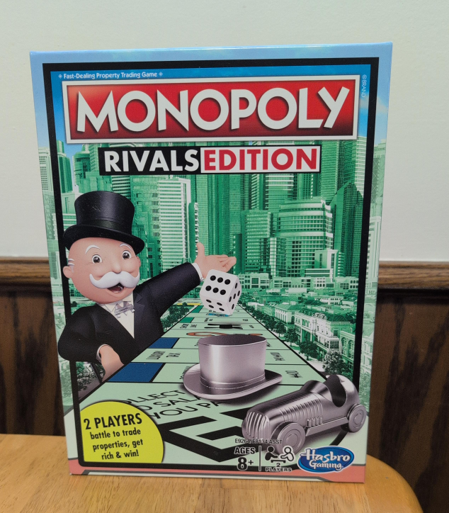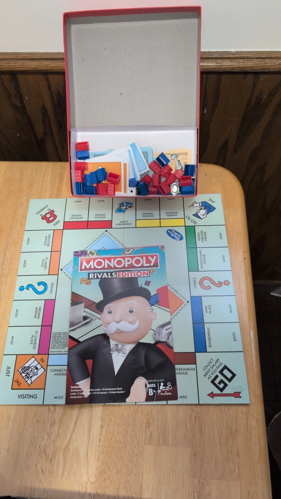 15Selling a Monopoly Rivals Edition board game! It includes: - Gameboard - 16 Chance cards - 16 Community Chest cards - 2 zinc tokens - 16 red houses - 16 blue houses - Money pack - Die - Game guide The box is included!