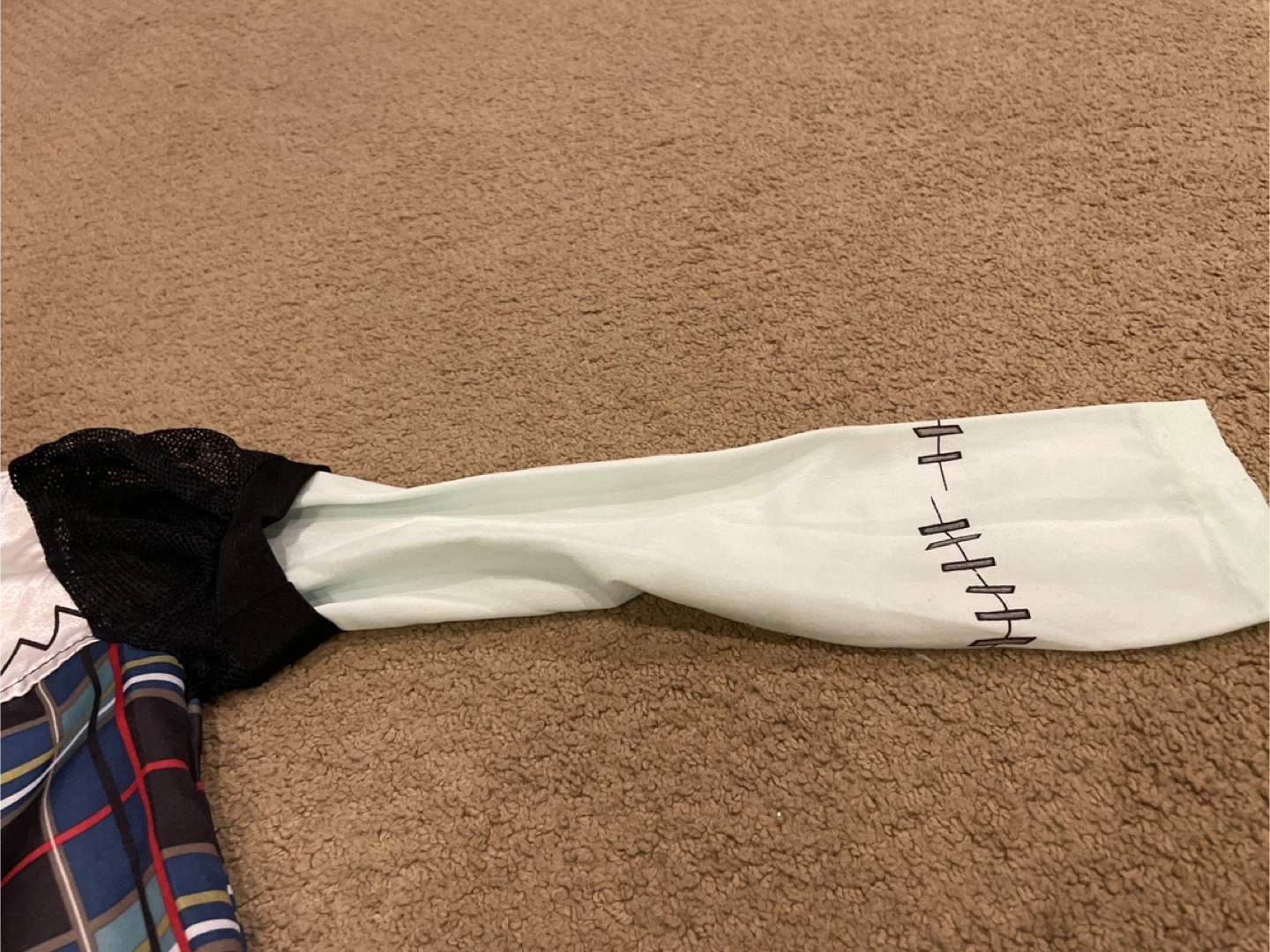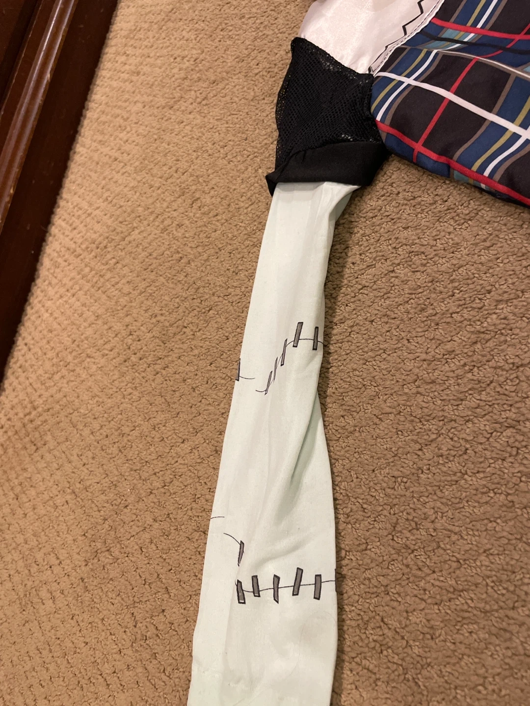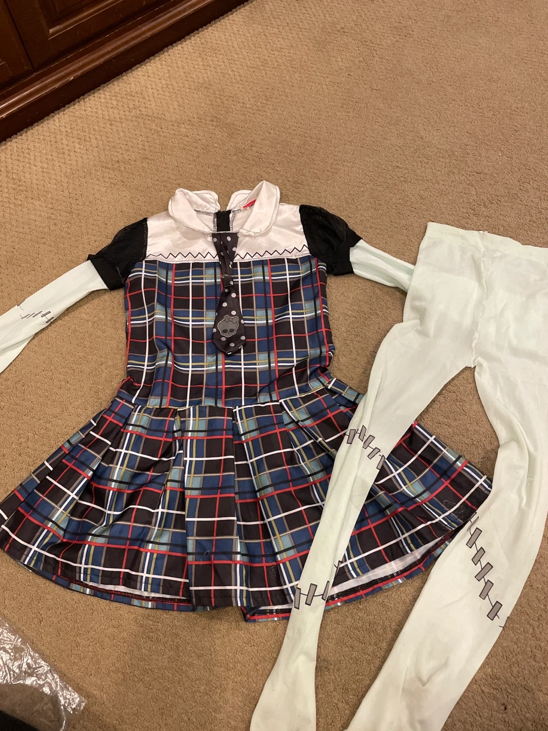 10Monster High Frankie Stein costume for sale! It includes the dress, tie, and leggings. The dress is a cute plaid pattern with a white collar and black mesh sleeves. The leggings have Frankie's signature stitch marks. Size is M.