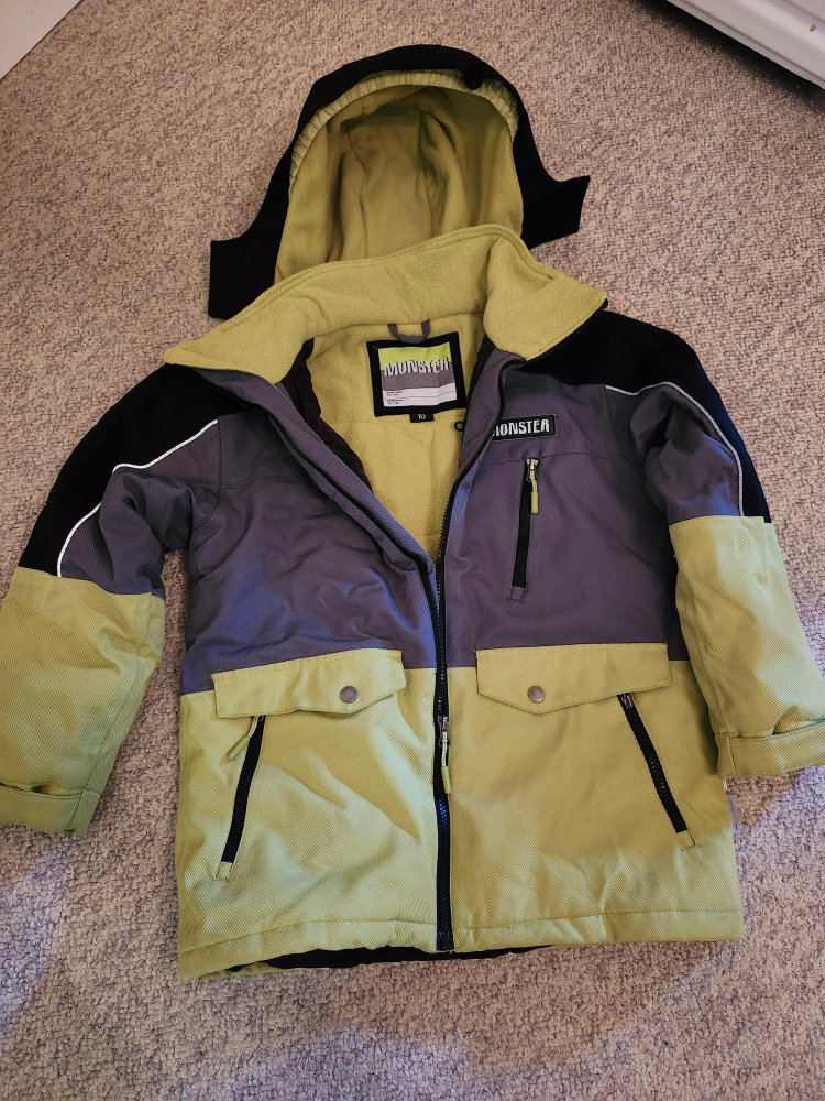 10Selling a gently used Monster brand snow jacket and pants set in size 10. The jacket features a hood and multiple pockets, perfect for keeping your little one warm and organized on the slopes. The pants are black with adjustable straps. Excellent condition. No rips.