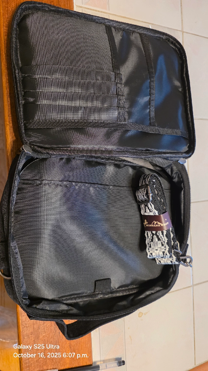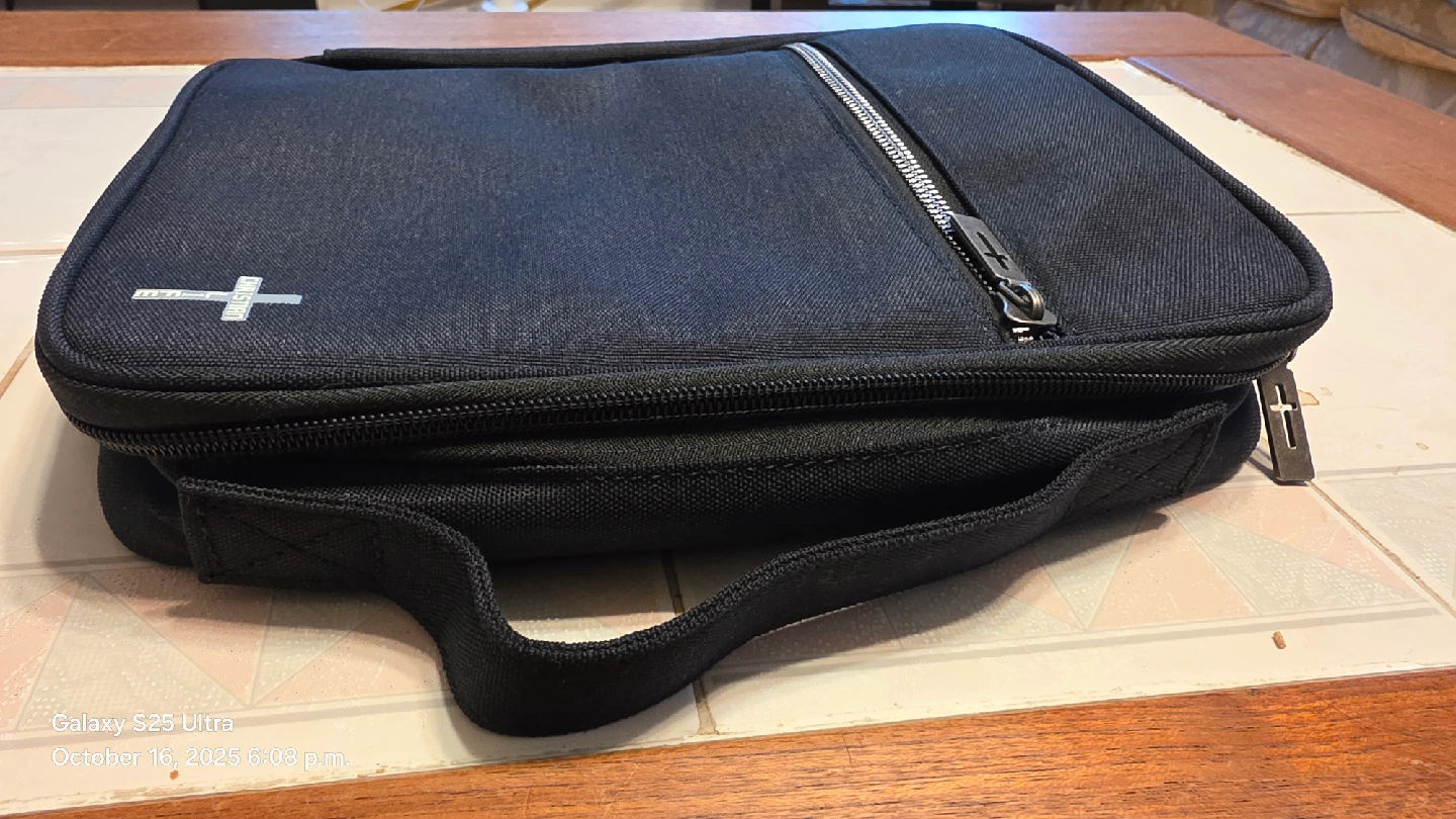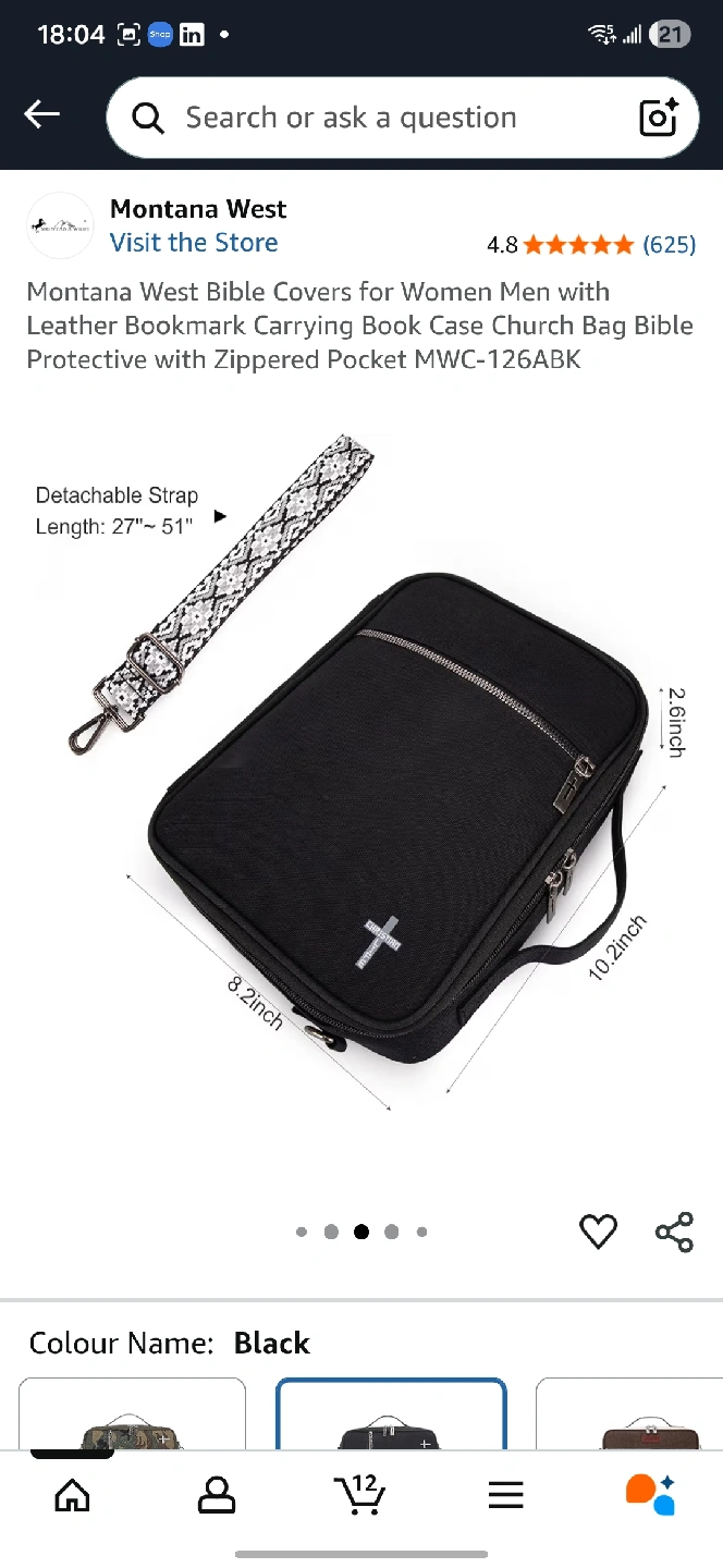 This is a Montana West black Bible cover book case. It has a detachable strap with a length of 27" to 51". The original price was $29.00. It also has a leather bookmark carrying case. It's in great condition and ready for a new home!
