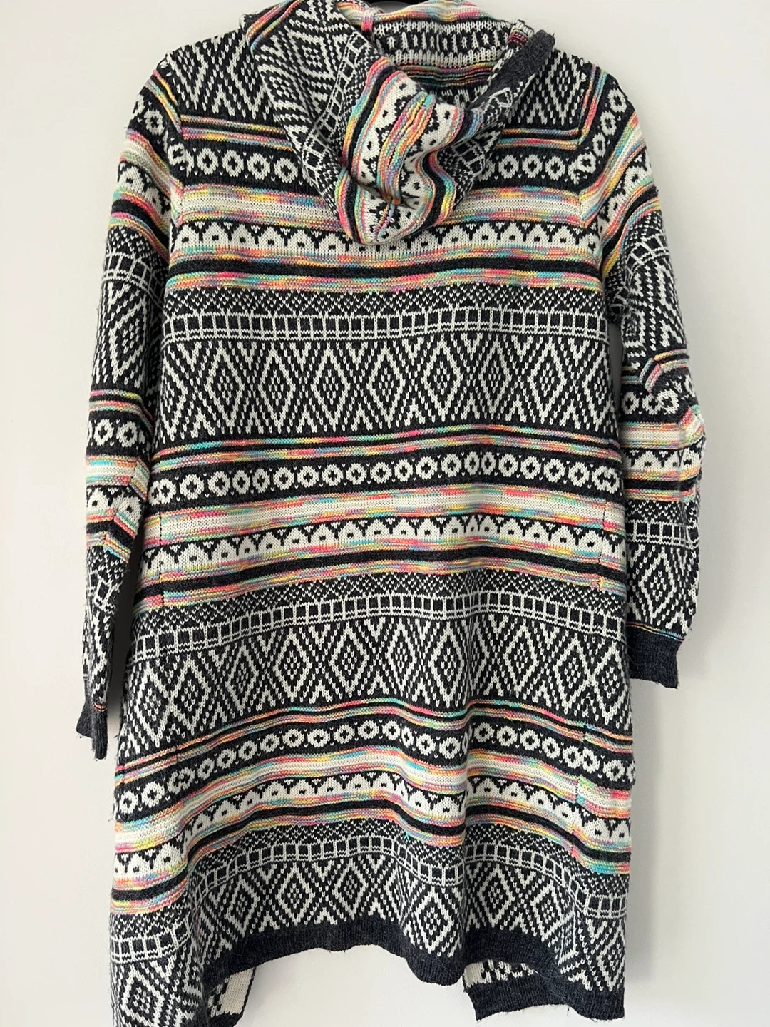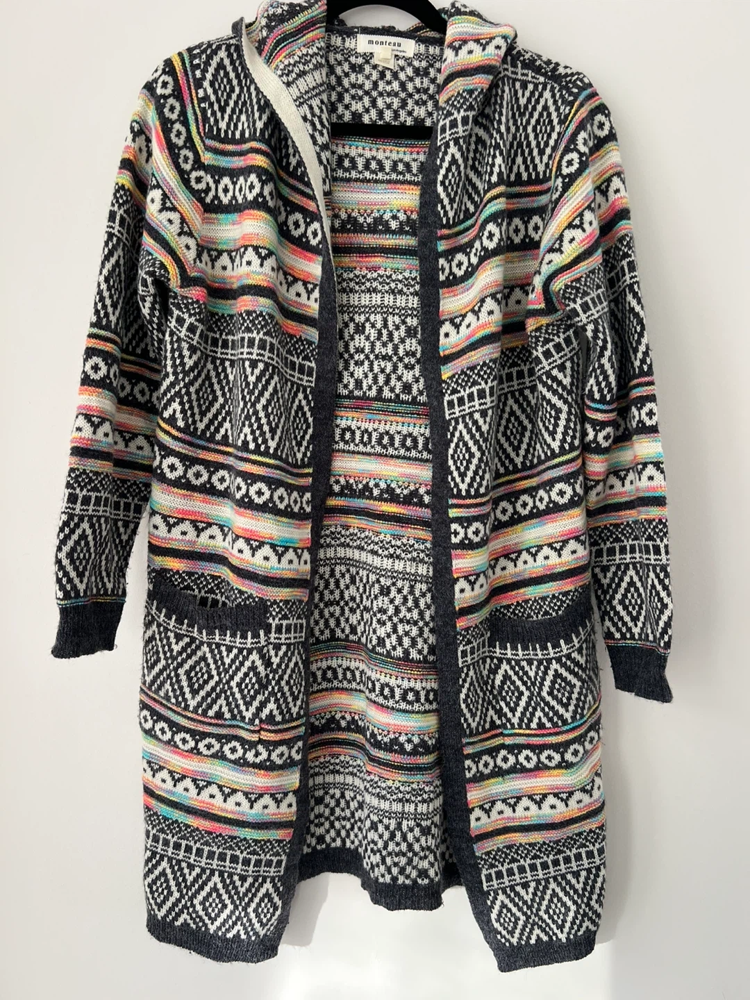83Cozy up in this cute Monteau hooded cardigan! It features a unique pattern with colourful accents. It's a size small and perfect for layering on those cooler days