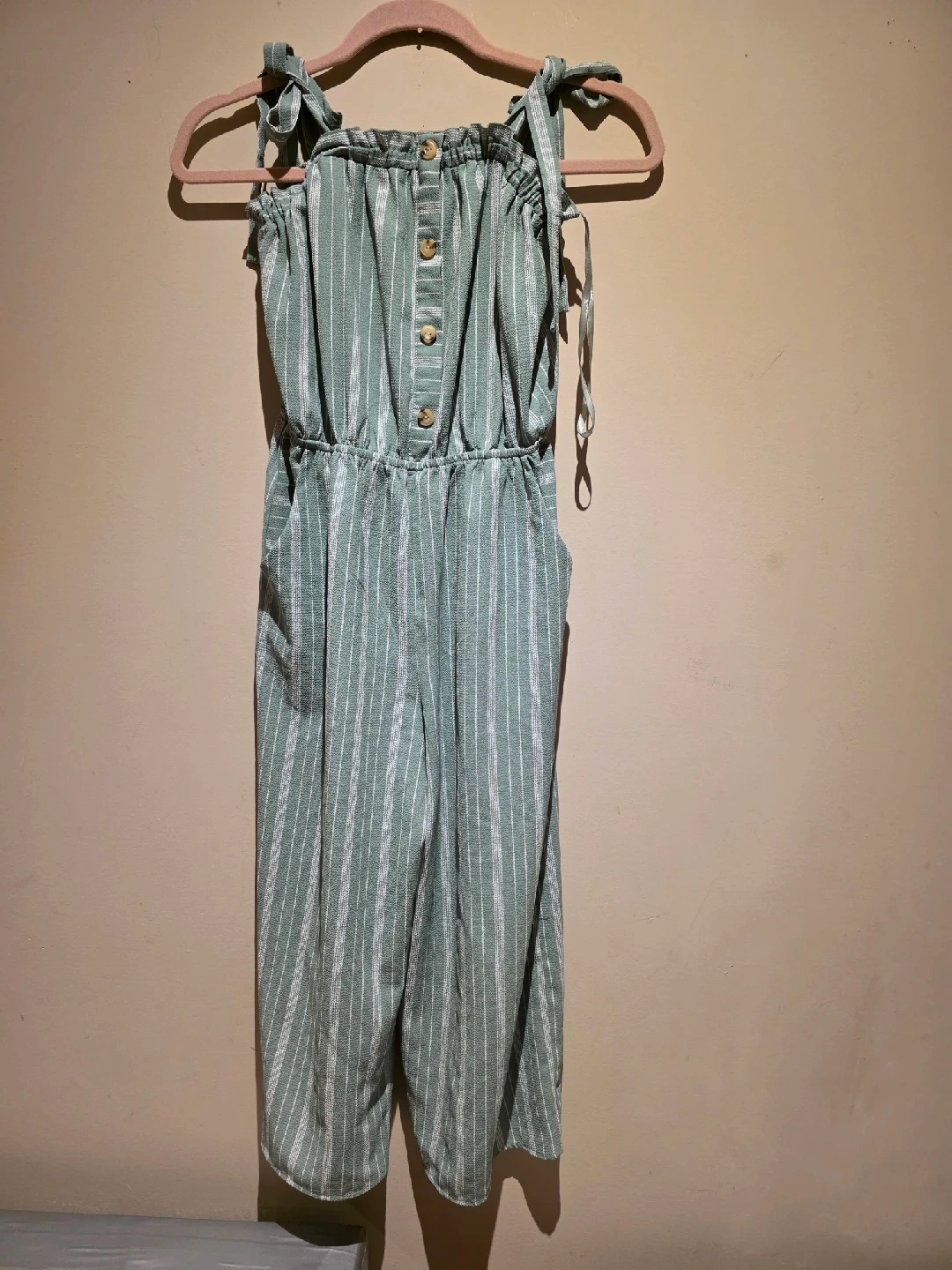 60Selling a cute Moiteau jumpsuit in a striped pattern! It's a size medium and features a button-up front and tie straps. Perfect for a casual day out