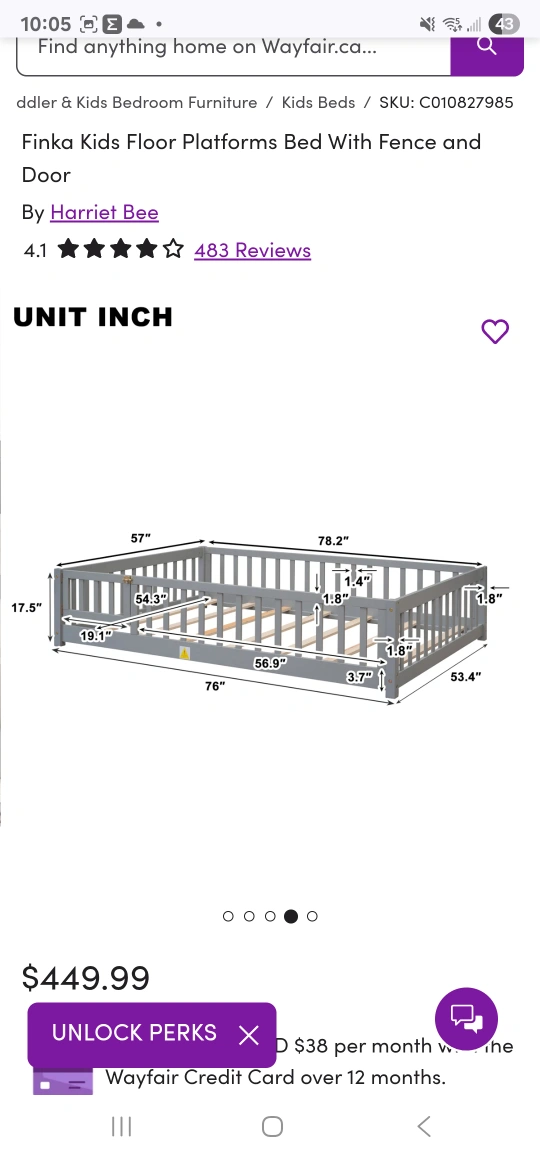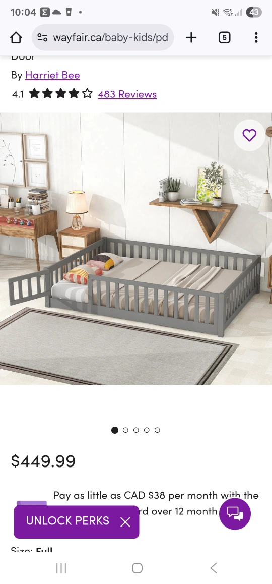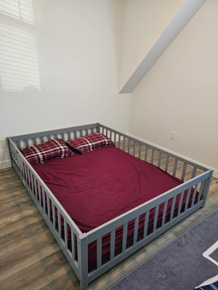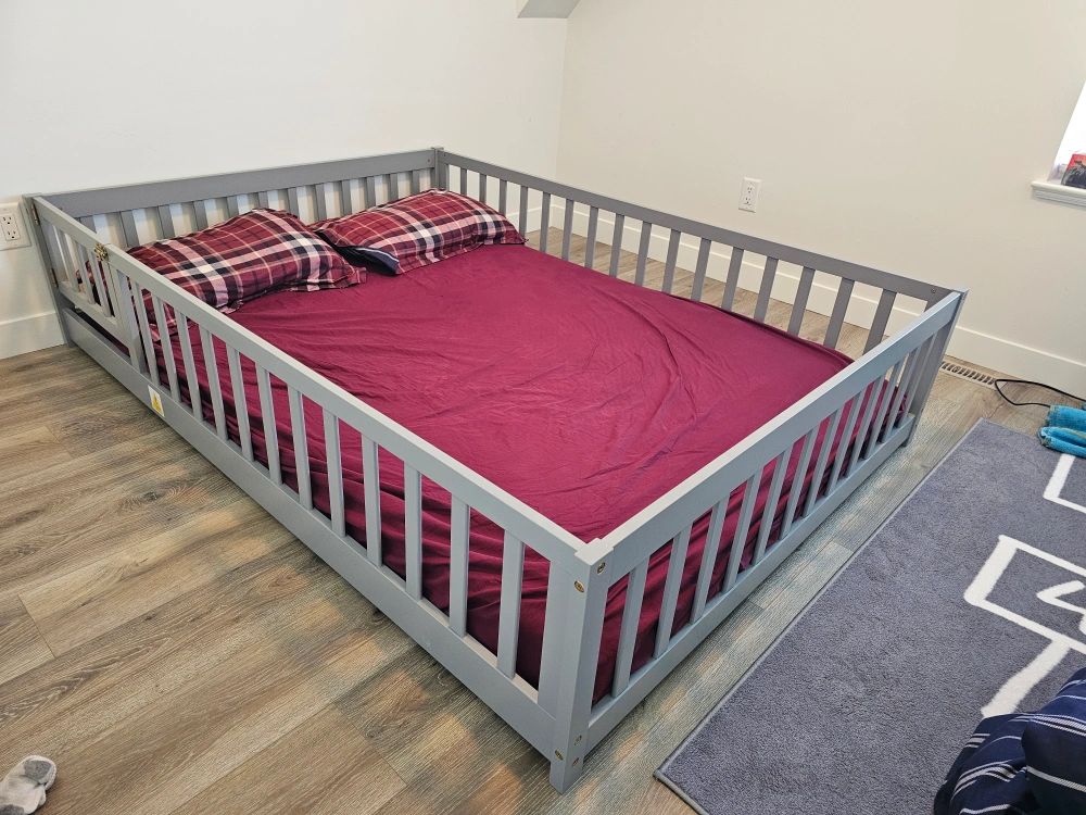 Selling a Montessori style Kids Floor Platform Bed with Fence and Door! It's in great shape and ready for a new home. The dimensions are approximately 76 inches by 57 inches. Originally bought for $450. Very clean Med. firm Mattress with protector included.