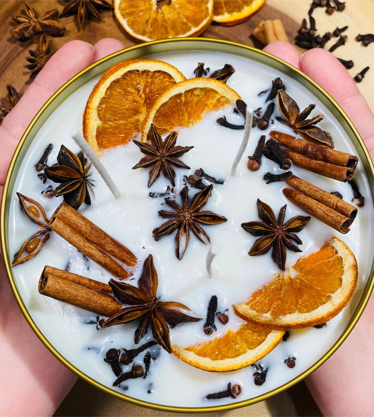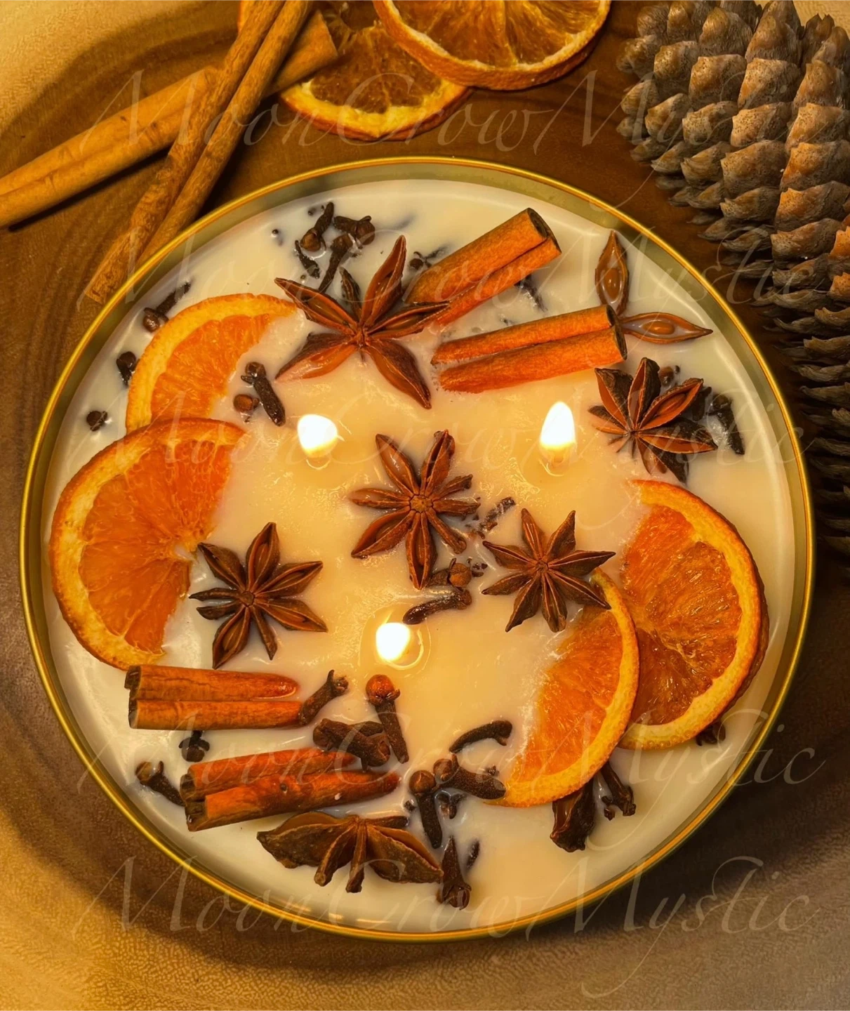 10Selling a Moon Glow Mystic candle! It's decorated with cinnamon sticks, orange slices, star anise, and cloves. It measures approximately 5.5" in diameter and 2.25" in height, making it a beautiful addition to any space