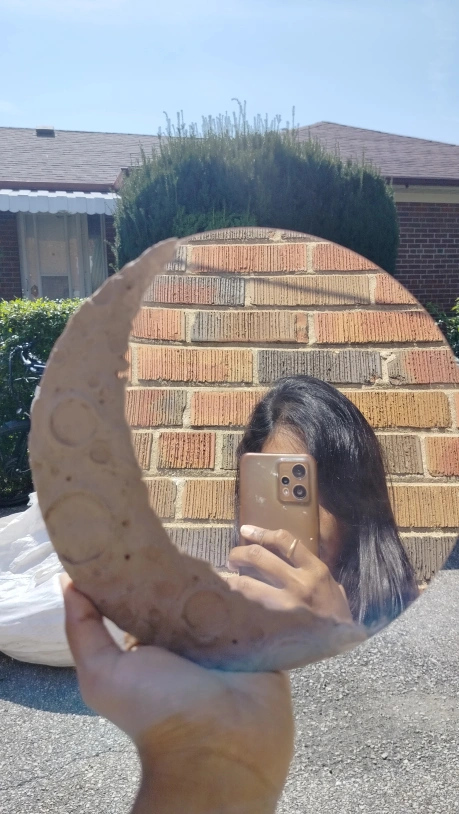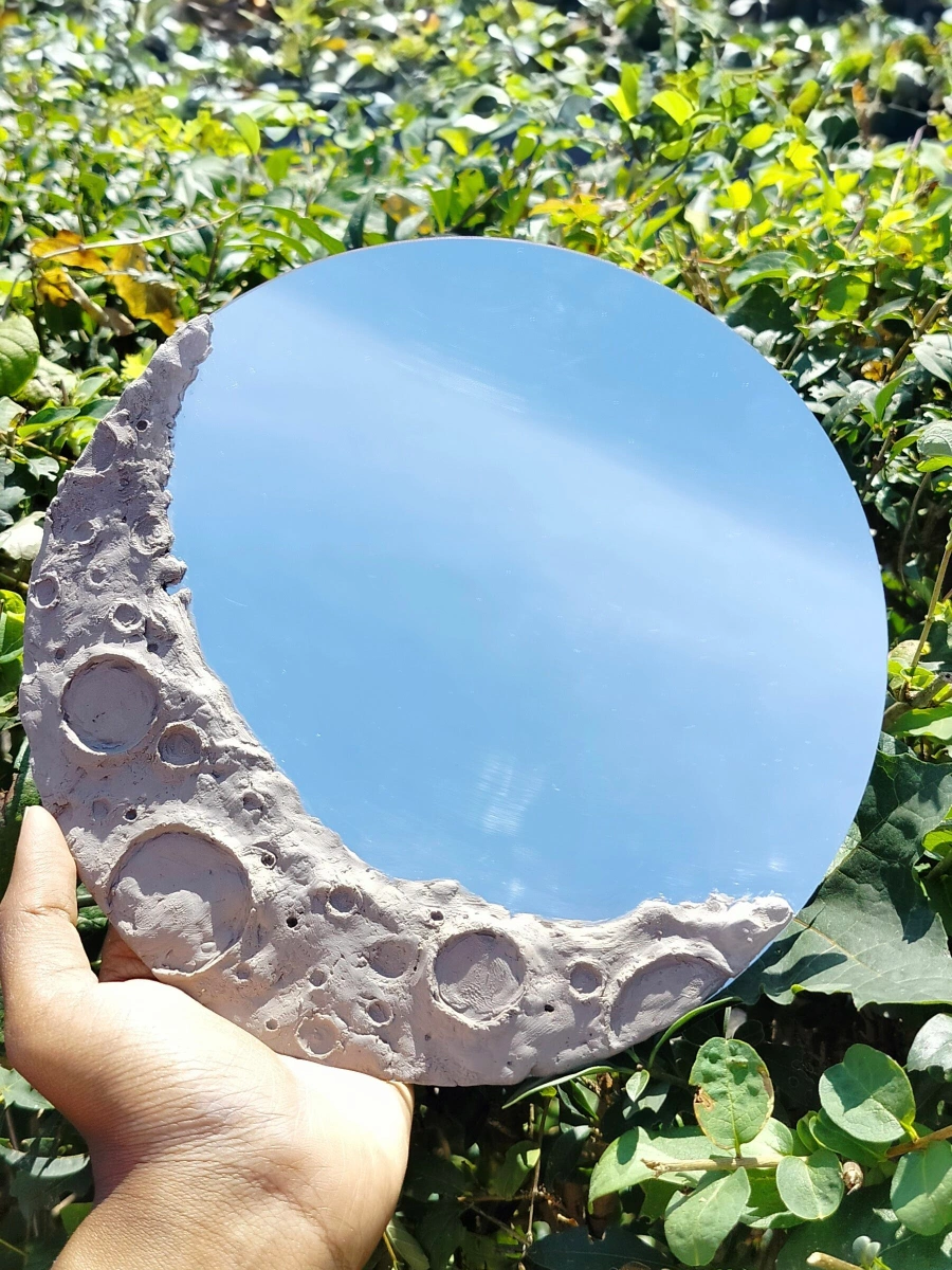 173This is a decorative round mirror with a crescent moon design. The mirror is about 9" in diameter and is made from glass and clay. size and shape is customisable. 18 - for Acrylic Mirror 30 - for Glass Mirror can stick to can hard surface.