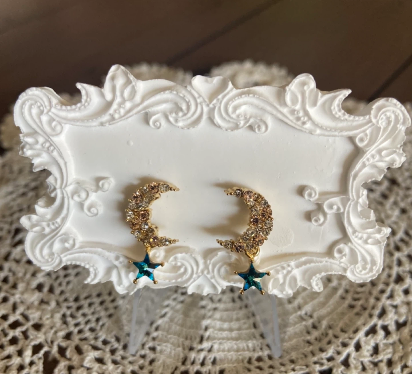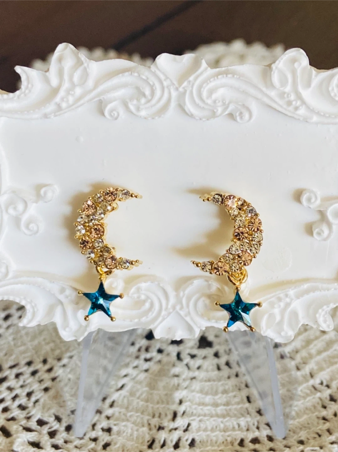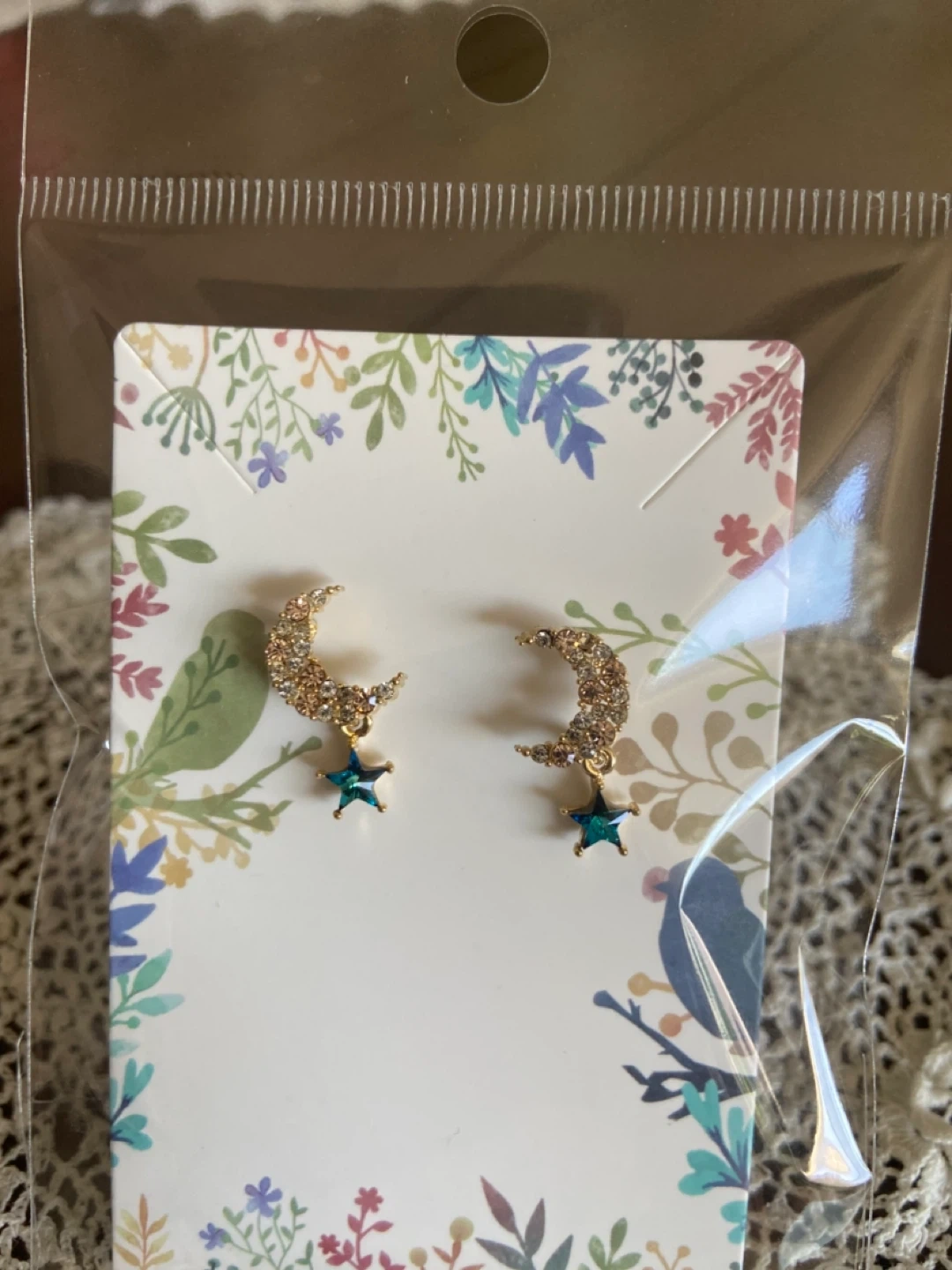 10These earrings feature a crescent moon shape adorned with sparkling rhinestones and a dangling blue star. They’re perfect for adding a touch of whimsy to any outfit! The earrings are in great condition and come in their original packaging.