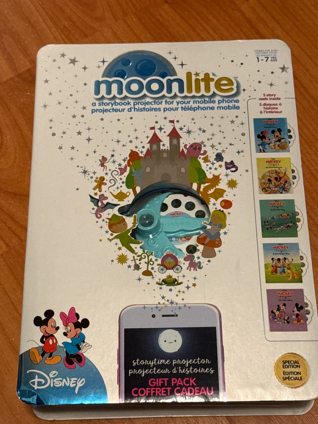 Get ready for bedtime stories with this Moonlite storybook projector! It works with your mobile phone to project stories onto the ceiling. This set includes 8 story reels: The Princess and the Pea, Love You Forever, Chicka Chicka Boom Boom, and five Mickey Mouse stories. Perfect for ages 1-7 years