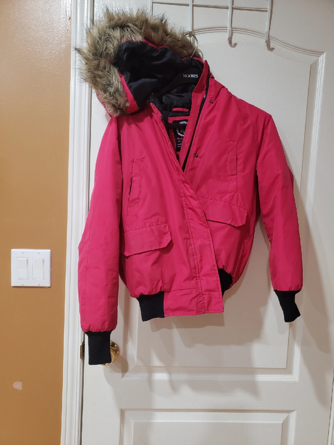 43Cozy and stylish Moose Knuckles bomber jacket in size M! It's a vibrant pink colour. The jacket features a fur-trimmed hood and is perfect for staying warm during the colder months