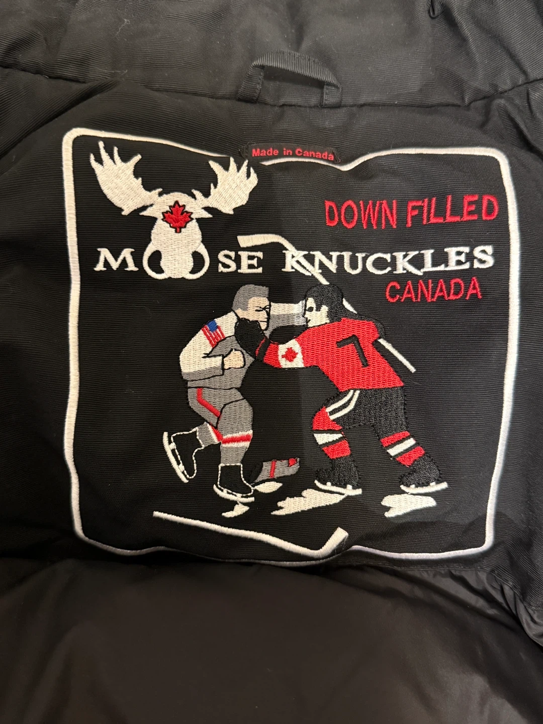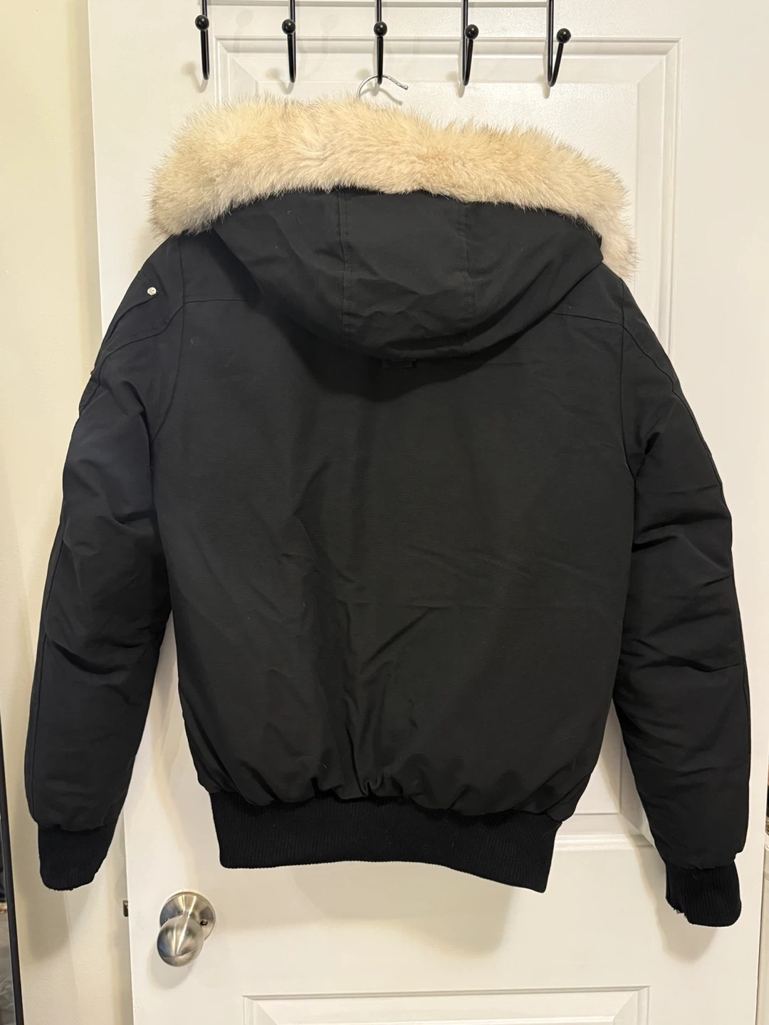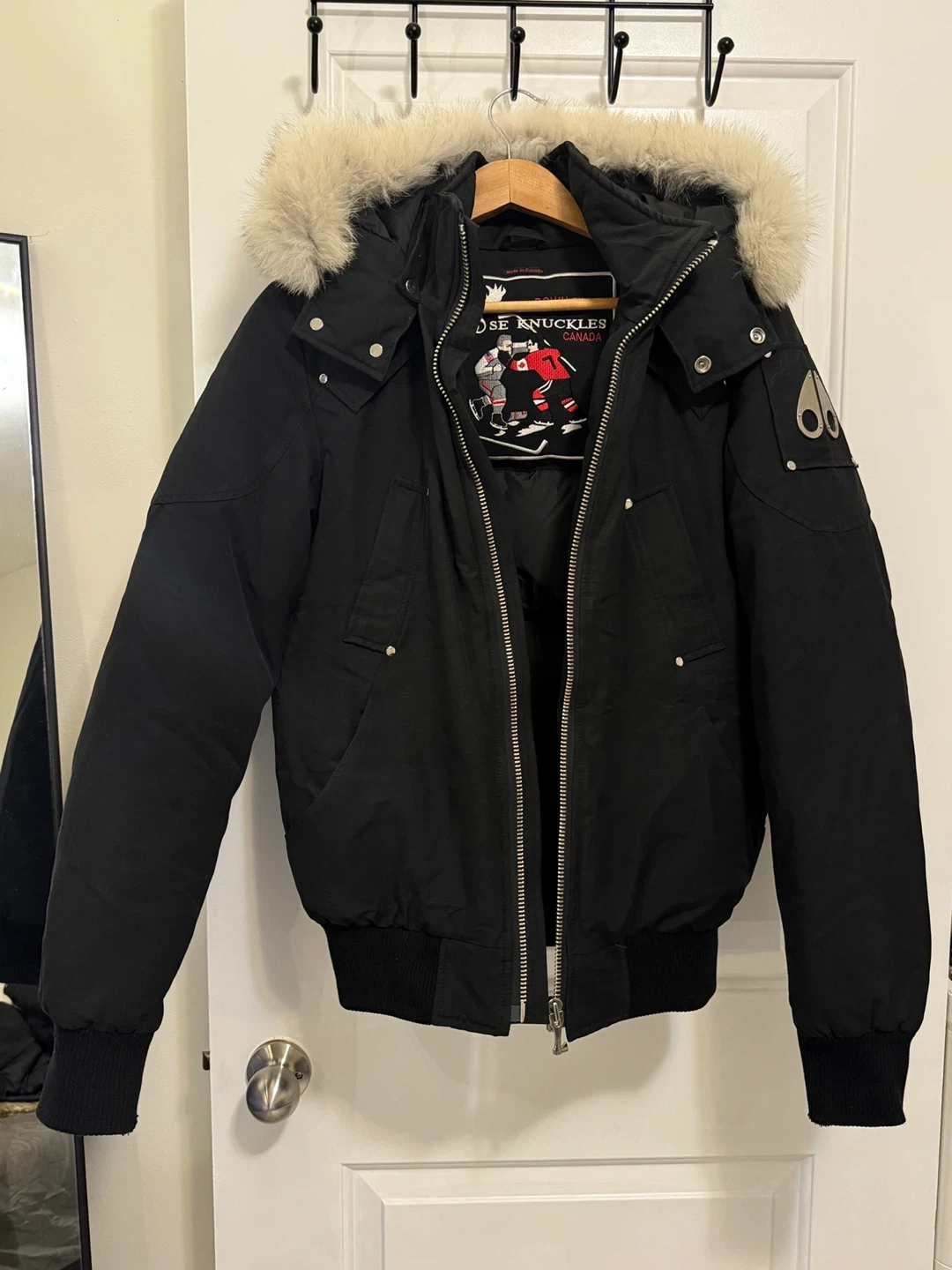 60Selling a Moose Knuckles bomber jacket in size small. There is a small damage in the wrist cuff, as shown in the photos.