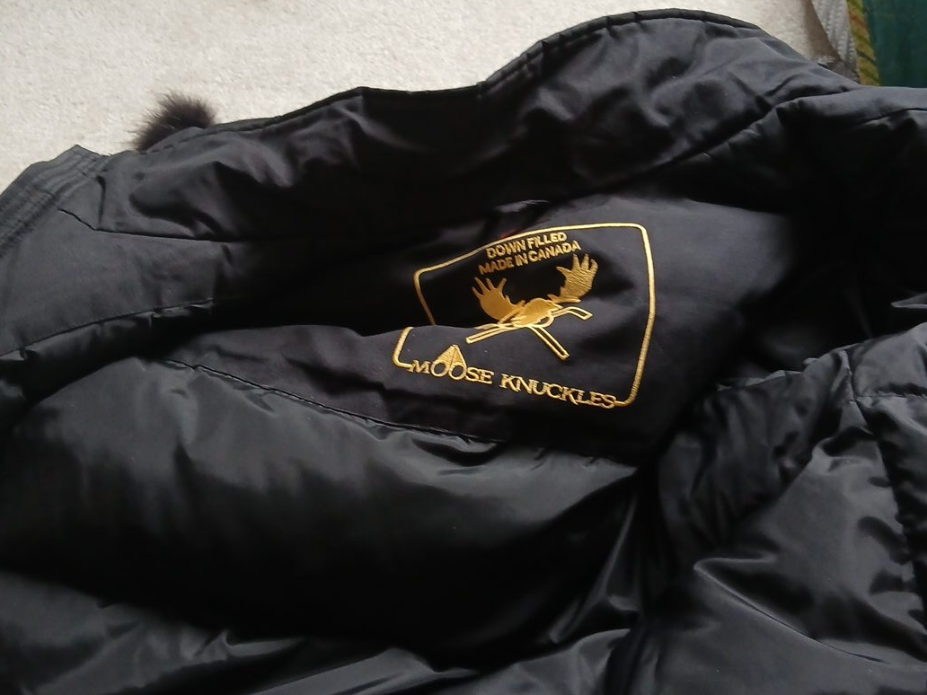 I'm selling a black Moose Knuckles down-filled jacket. It's in great condition and ready to keep you warm this winter! The jacket features a fur-trimmed hood and gold accents.