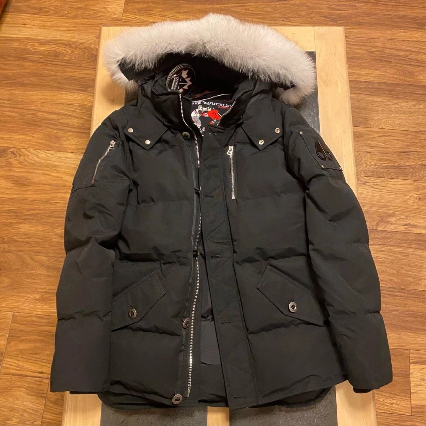 Selling a Moose Knuckles Stirling Parka in black! It's a super warm and stylish winter coat, perfect for those cold Canadian winters. It features a fur-trimmed hood and the iconic Moose Knuckles logo on the sleeve. Brand new condition!