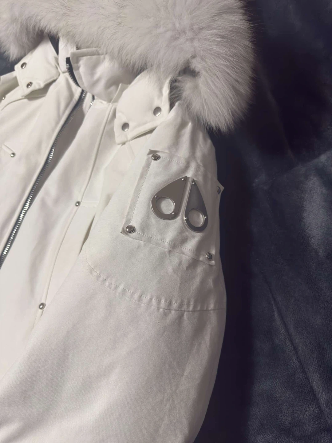 10Selling a Moose Knuckles white down parka. It's in great condition and ready for the cold weather! Features a fur-trimmed hood and the iconic Moose Knuckles logo on the sleeve