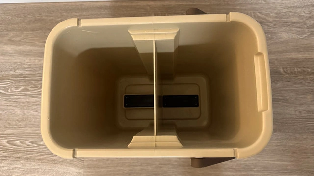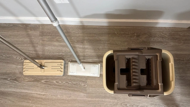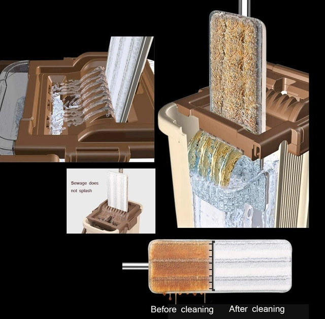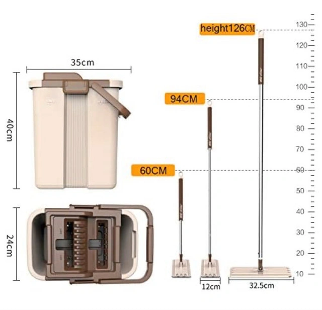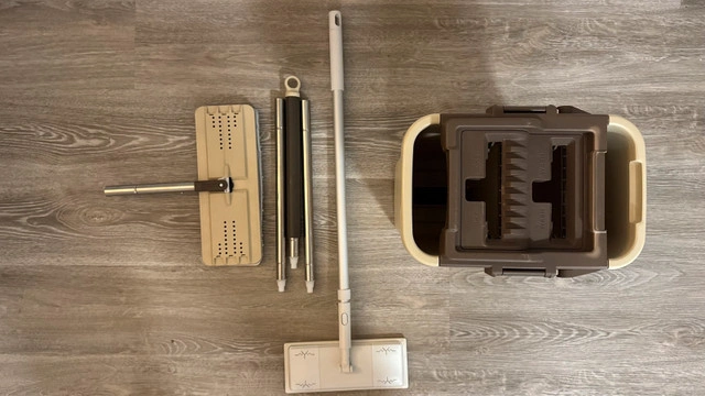 Flat mop and bucket set with self-wash & squeeze dry system, reusable microfiber refills, stainless steel handle for hardwood tile laminate floors cleaning. The handle gets smaller/shorter. It’s almost new apart from scratches on top. We didn’t use it because bought robot.
