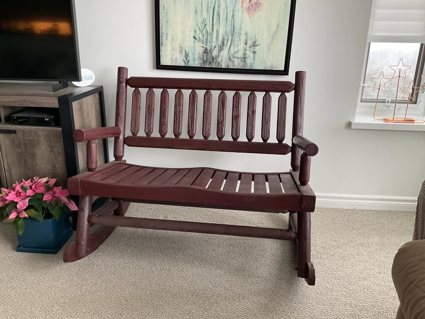 A sturdy wooden rocking bench in a dark brown finish. It features a slatted seat and backrest, perfect for relaxing on a porch or in a garden. This bench is built for comfort and durability!
