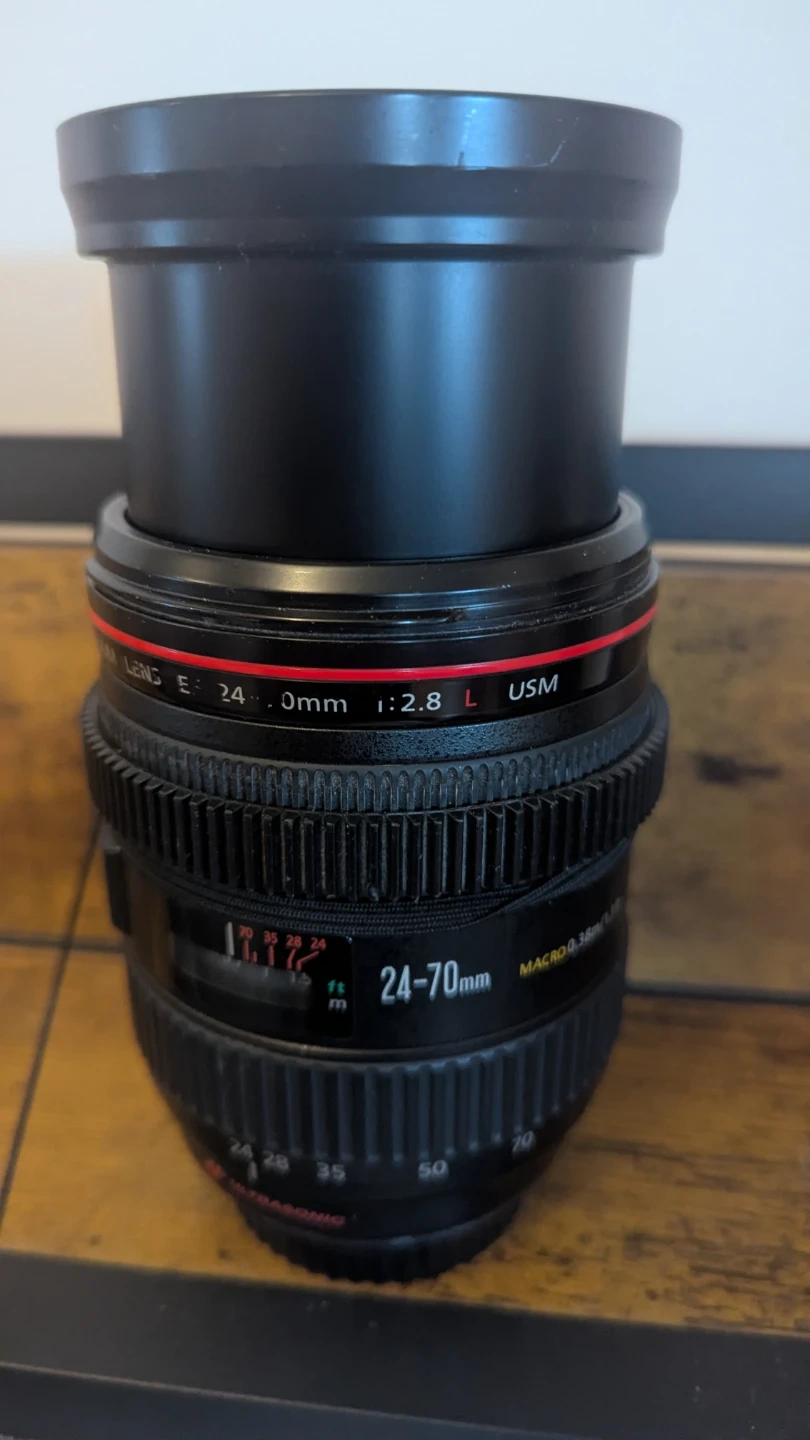 Canon EF L series zoom lens with a 24-70mm focal range and f/2.8 aperture. Features ultrasonic motor (USM) for fast autofocus. Includes EW-83J lens hood. Good for portraits and landscapes.