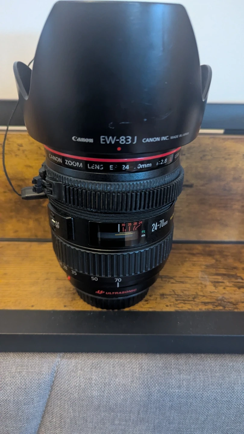 Canon EF L series zoom lens with a 24-70mm focal range and f/2.8 aperture. Features ultrasonic motor (USM) for fast autofocus. Includes EW-83J lens hood. Good for portraits and landscapes.