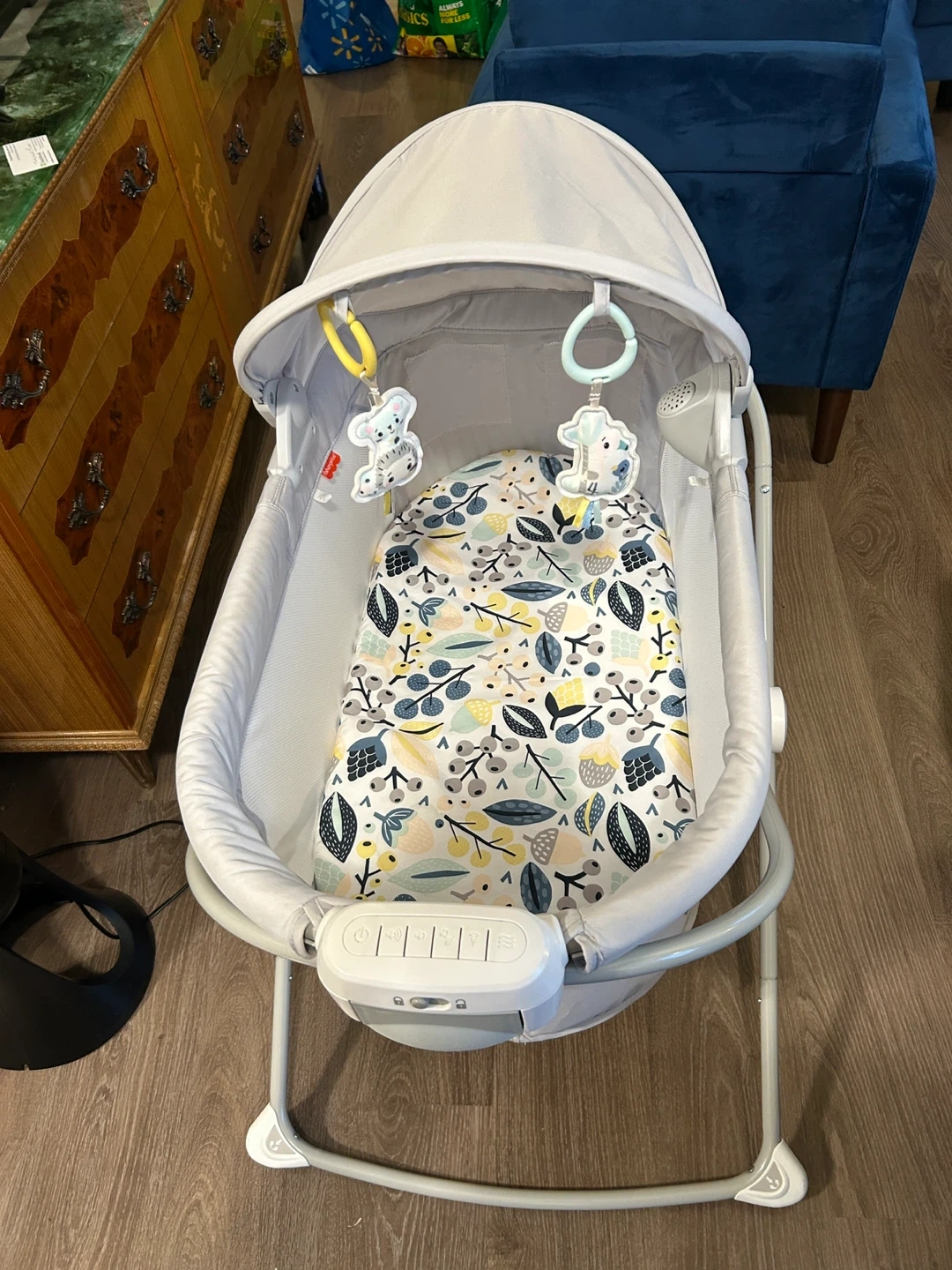 Selling a Fisher-Price Soothing Motions Bassinet! It's in excellent condition and ready for a new little one. The bassinet features gentle swaying motions, calming vibrations, and soothing sounds to help your baby drift off to sleep peacefully. It also includes hanging toys to entertain your baby while they're awake. A great addition to any nursery!