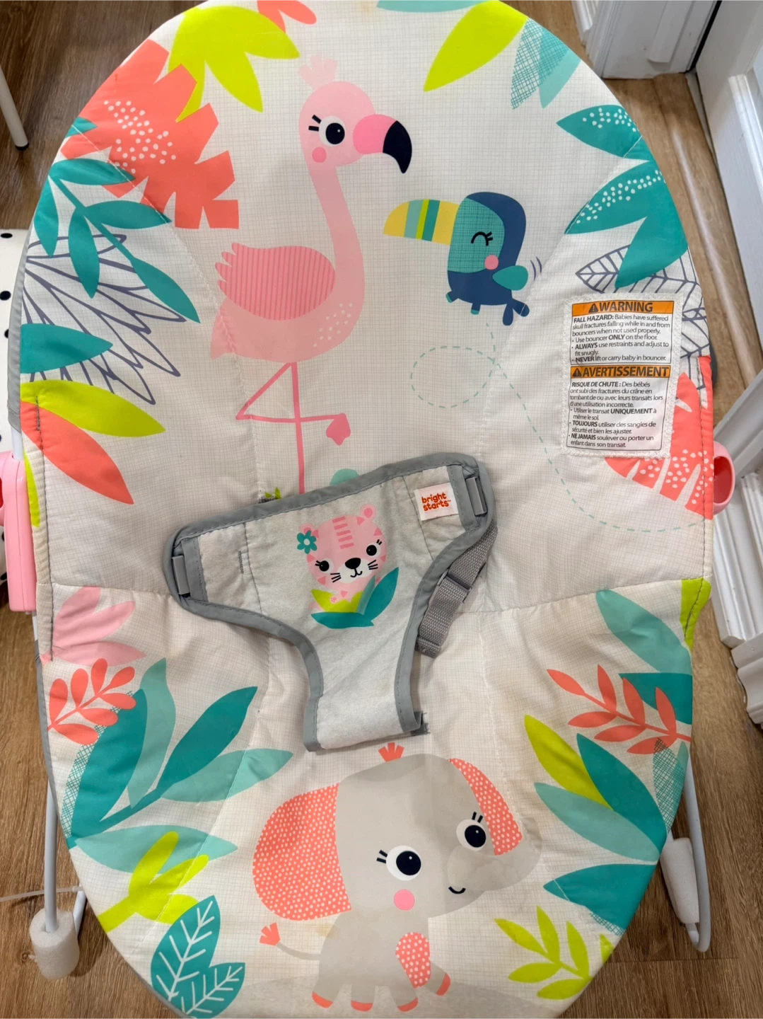 This bright and colourful baby bouncer seat features a fun tropical print with a flamingo and toucan. It includes a comfy padded seat and harness for your little one's safety.