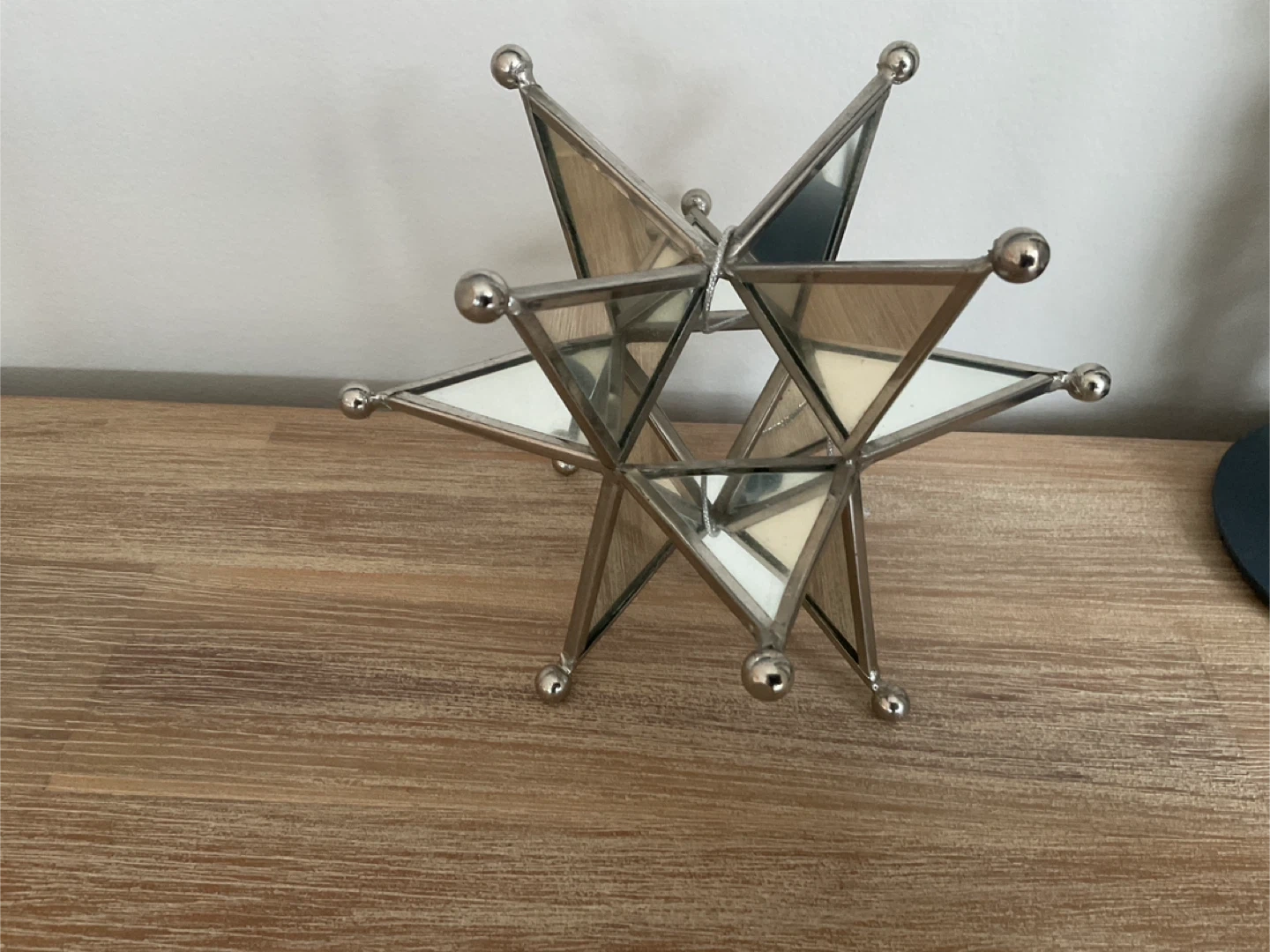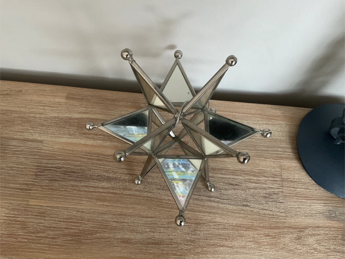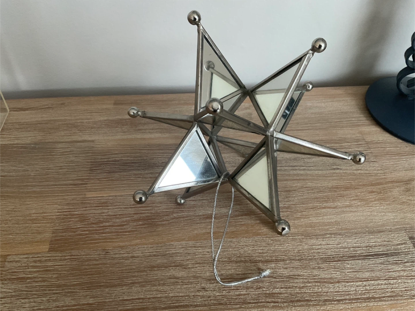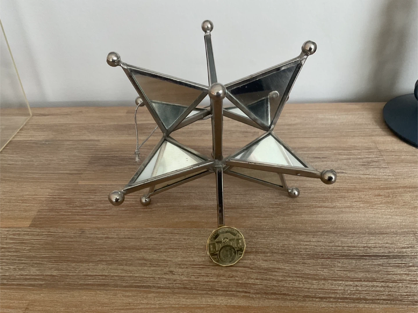 15Vintage large 12 point mirrored Moravian star with cord for hanging or can be displayed on table. Approximately 6”. Coin to show size