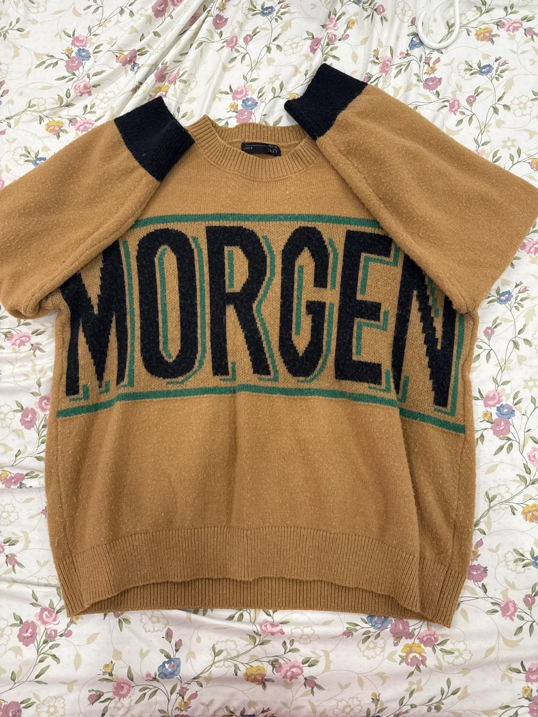 10Cozy DAZY knit sweater with a fun 'Morgen' graphic! The sweater is a tan colour with black and green accents. Perfect for adding a bit of style to your wardrobe!
