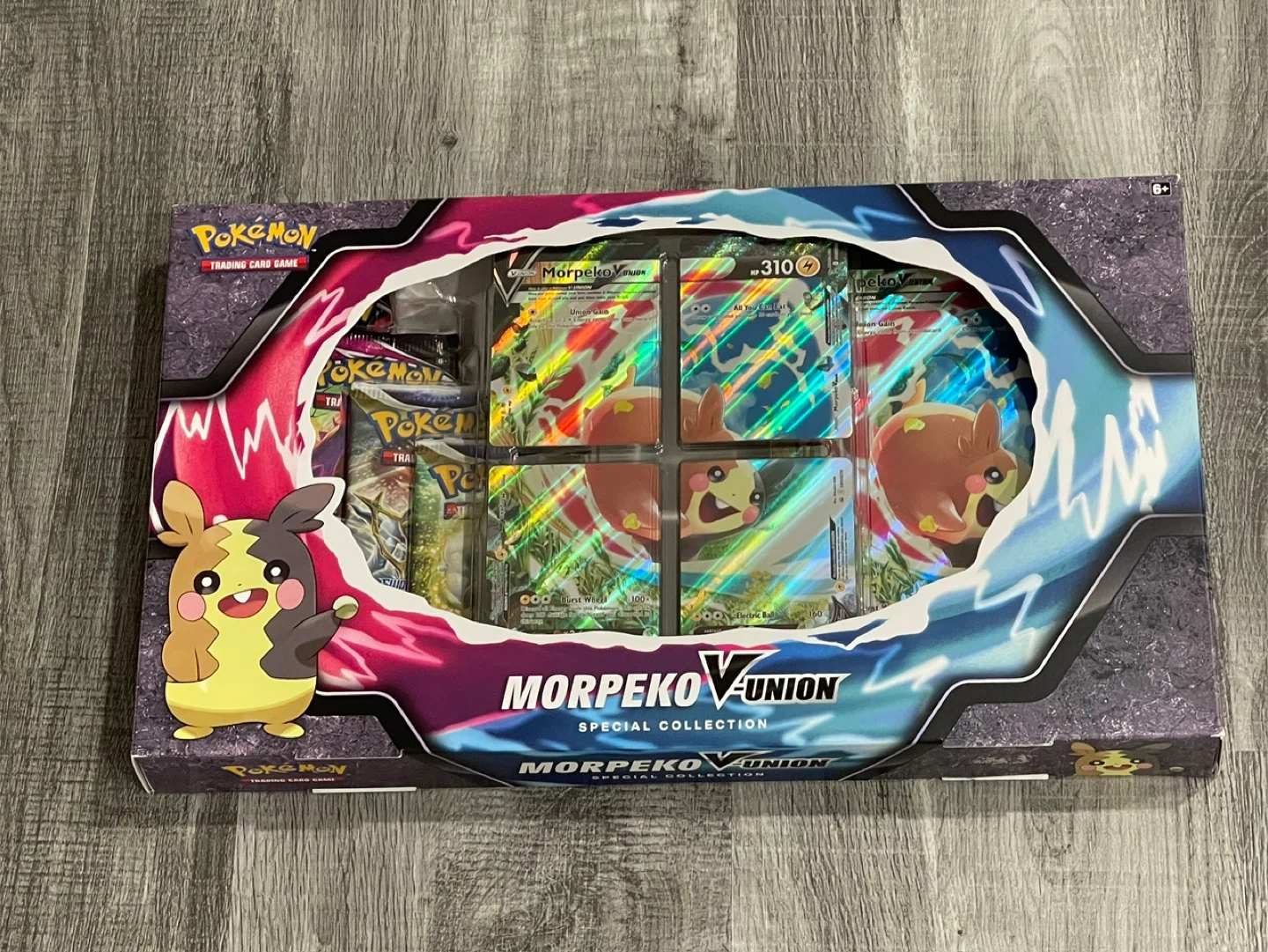 15Selling a sealed, brand new Morpeko V-Union Special Collection. This box contains: • 4 Promo Cards that make up a single Morpeko V-Union • 1 oversized card featuring Morpeko V-Union • 4 Pokemon TCG Booster Packs (2x Fusion Strike, 2x Brilliant Stars) • 1 helpful supporter card featuring professor Burnet • a Code card for the Pokemon TCG online game.