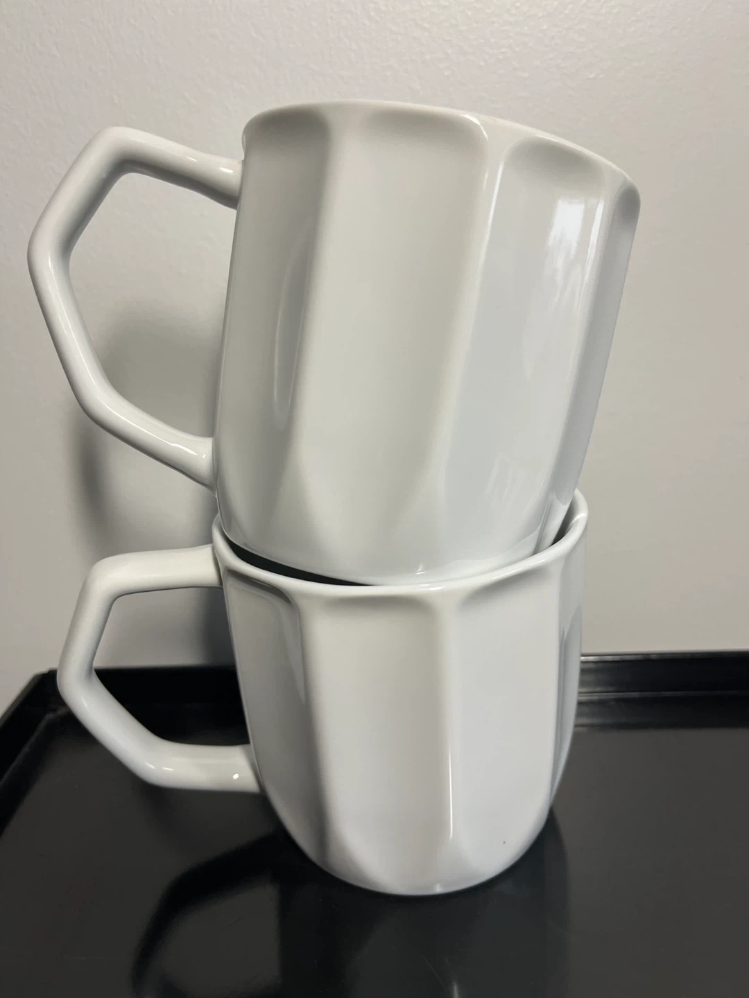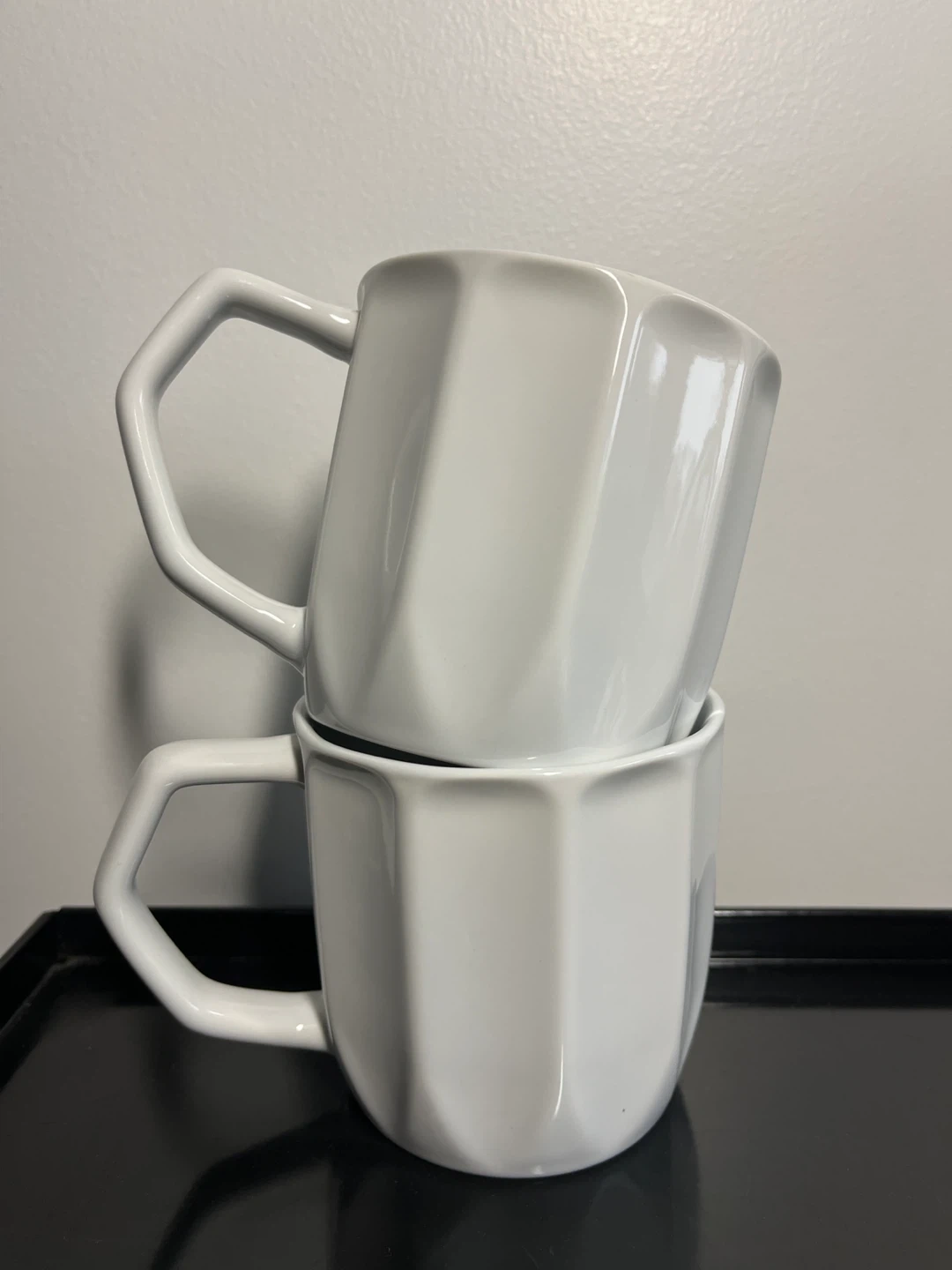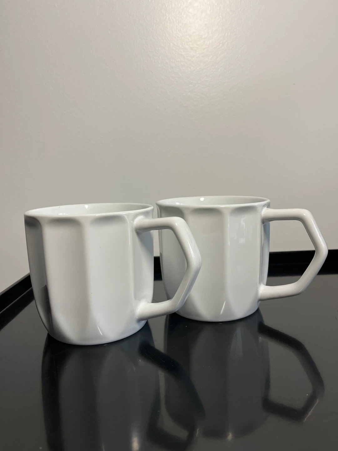 Two white ceramic mugs with a modern geometric design. They're great for your morning coffee or tea. The mugs are a nice size for a comforting beverage.
