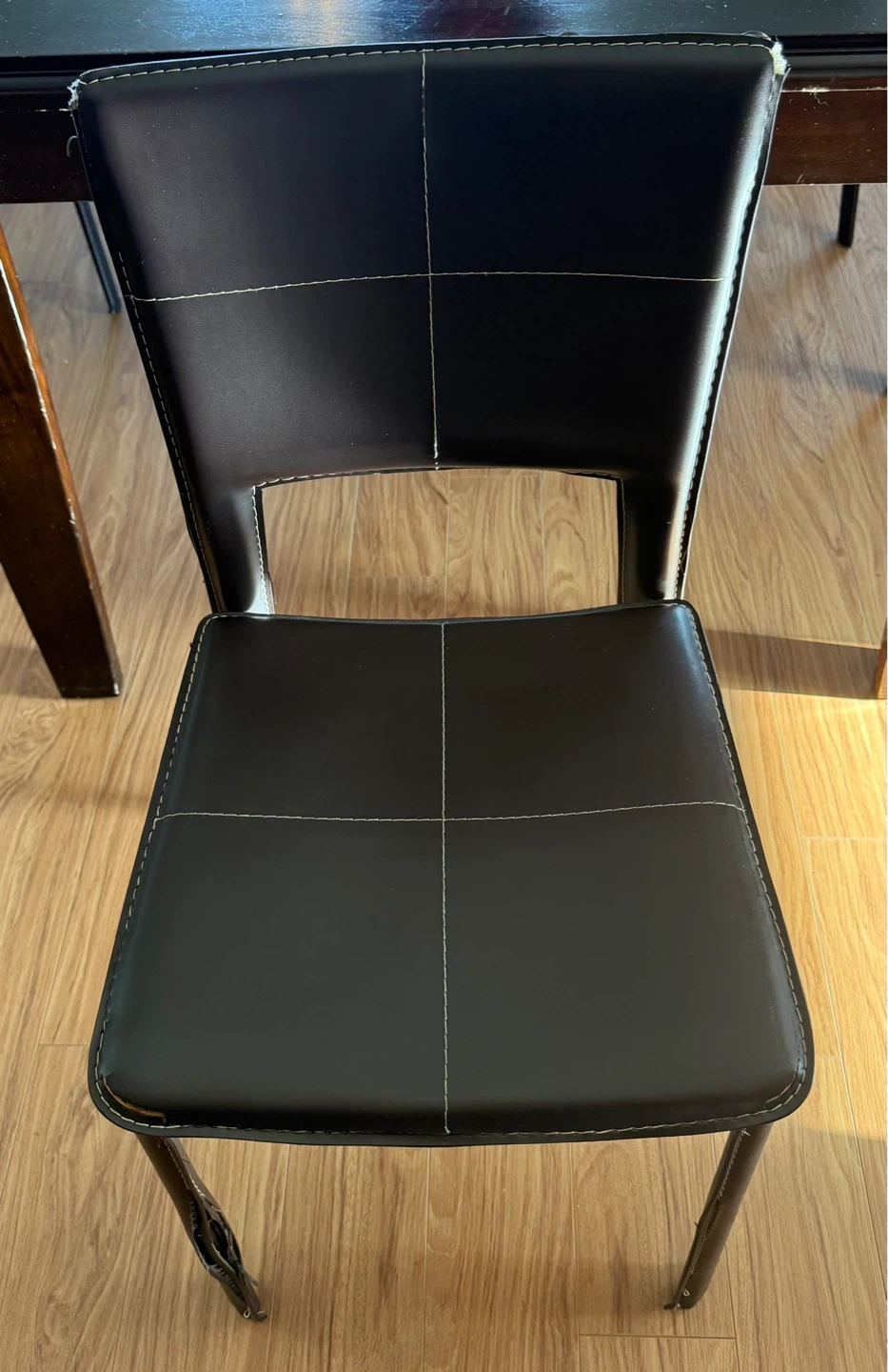 Chairs: in faux brown leather. Shows signs of wear but in good, functional condition.