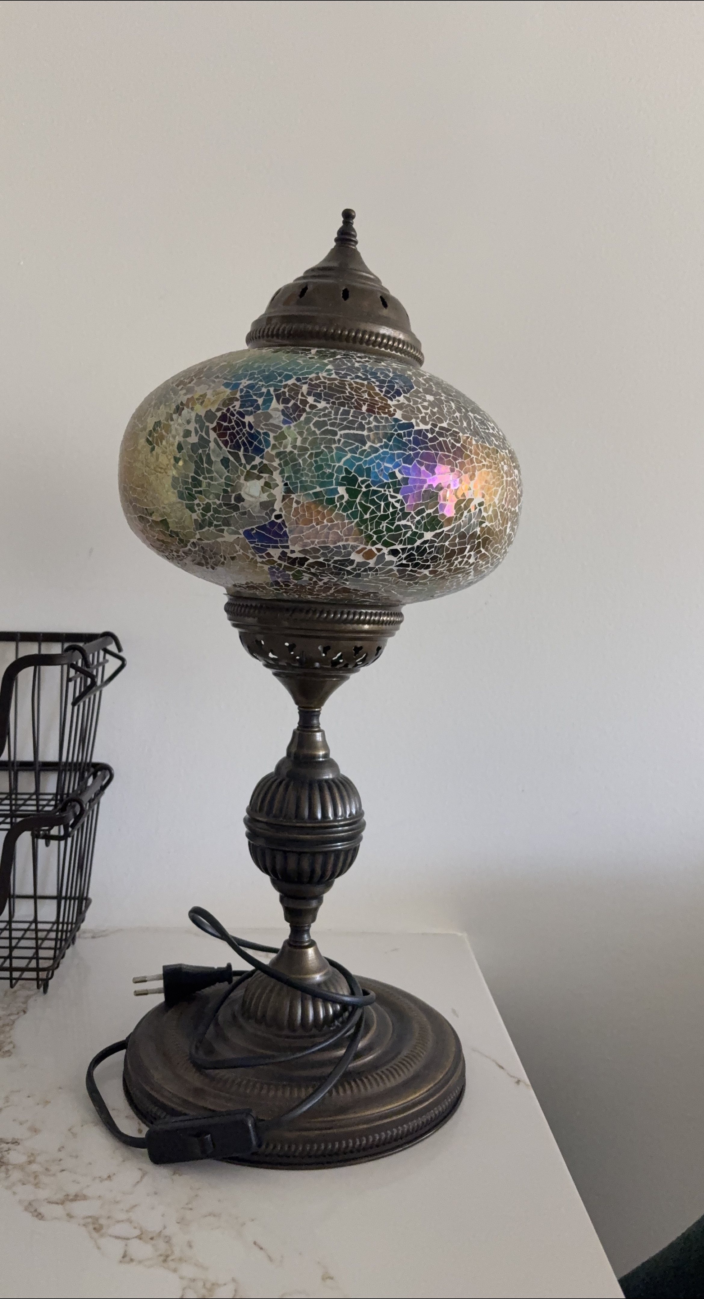 Selling a beautiful mosaic glass table lamp. It has a bronze-coloured base and a multi-coloured glass shade that creates a lovely ambient light. Perfect for adding a touch of warmth to any room!