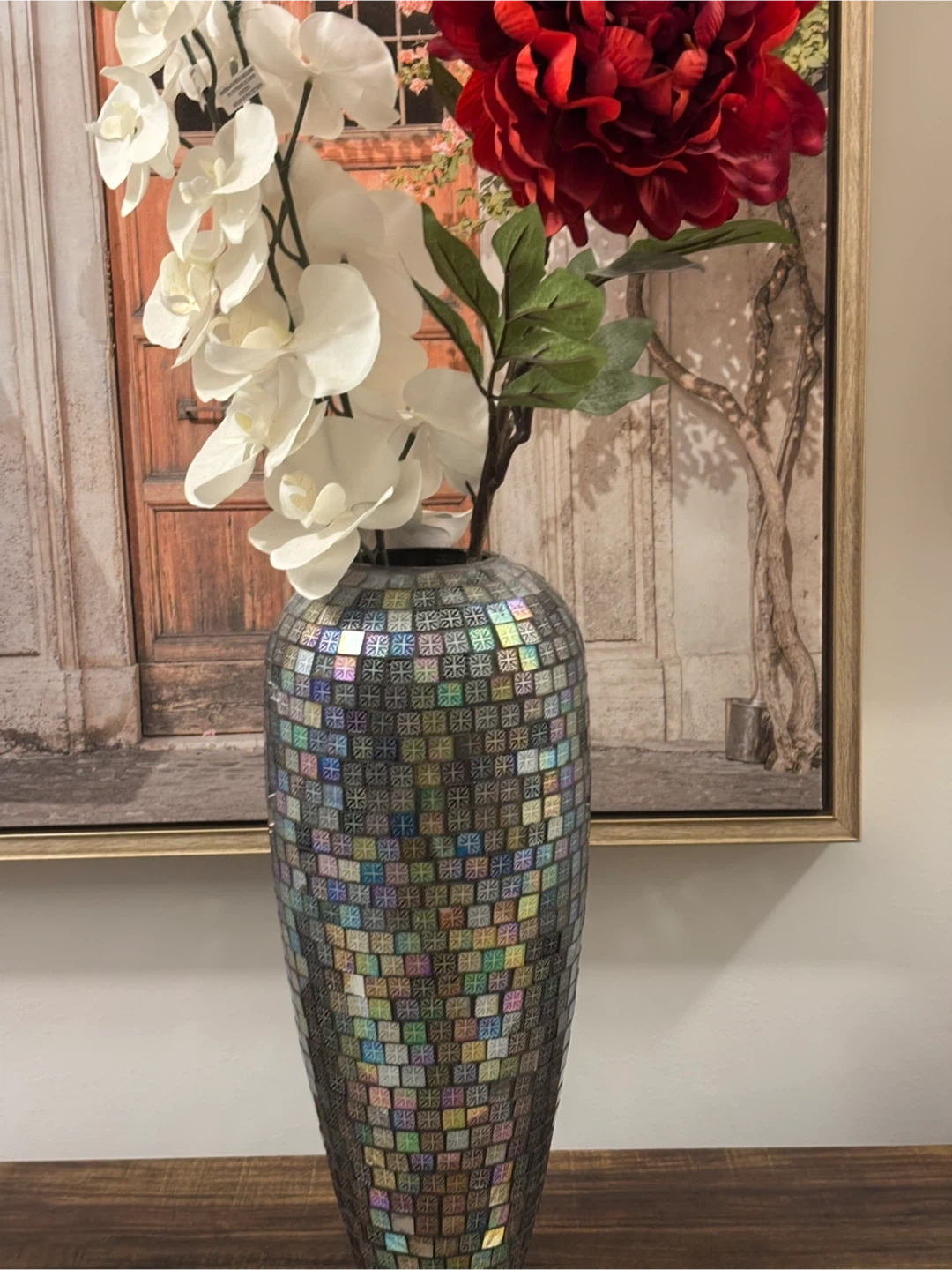 18Here's a beautiful mosaic vase that could be a great addition to your home decor! It has a unique design and catches the light nicely