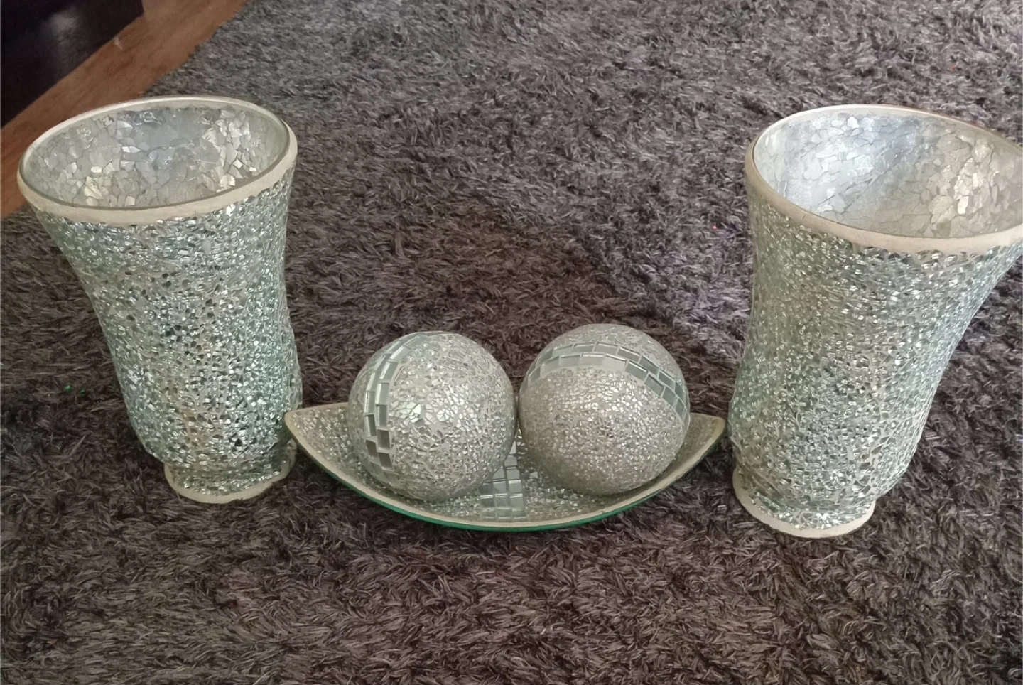 Add a touch of sparkle to your home with this lovely set! It includes two mosaic vases, two mosaic spheres, and a decorative dish to display them on. Perfect for adding some shimmer to any room