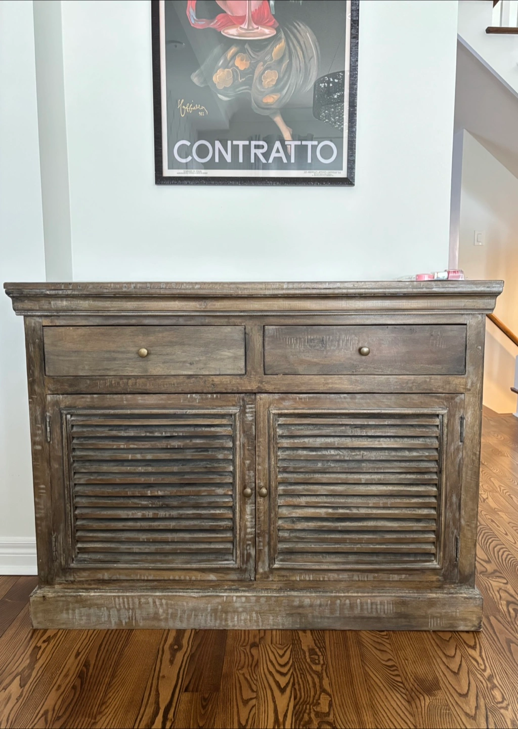 Beautiful sideboard with two drawers and two louvered doors. Dark grey-brown finish. Solid wood construction. French country style. Great for entryway, dining room, or living room.