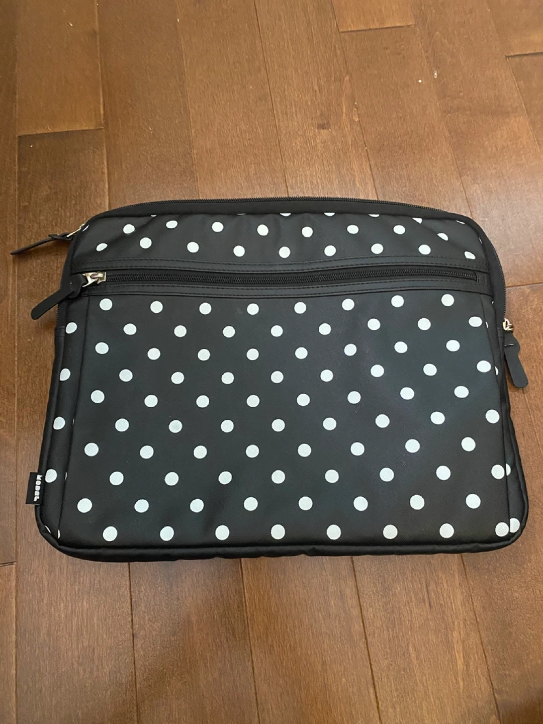 5Selling a MOSSL laptop case in black with white polka dots. It has a zipper closure and is in great condition!