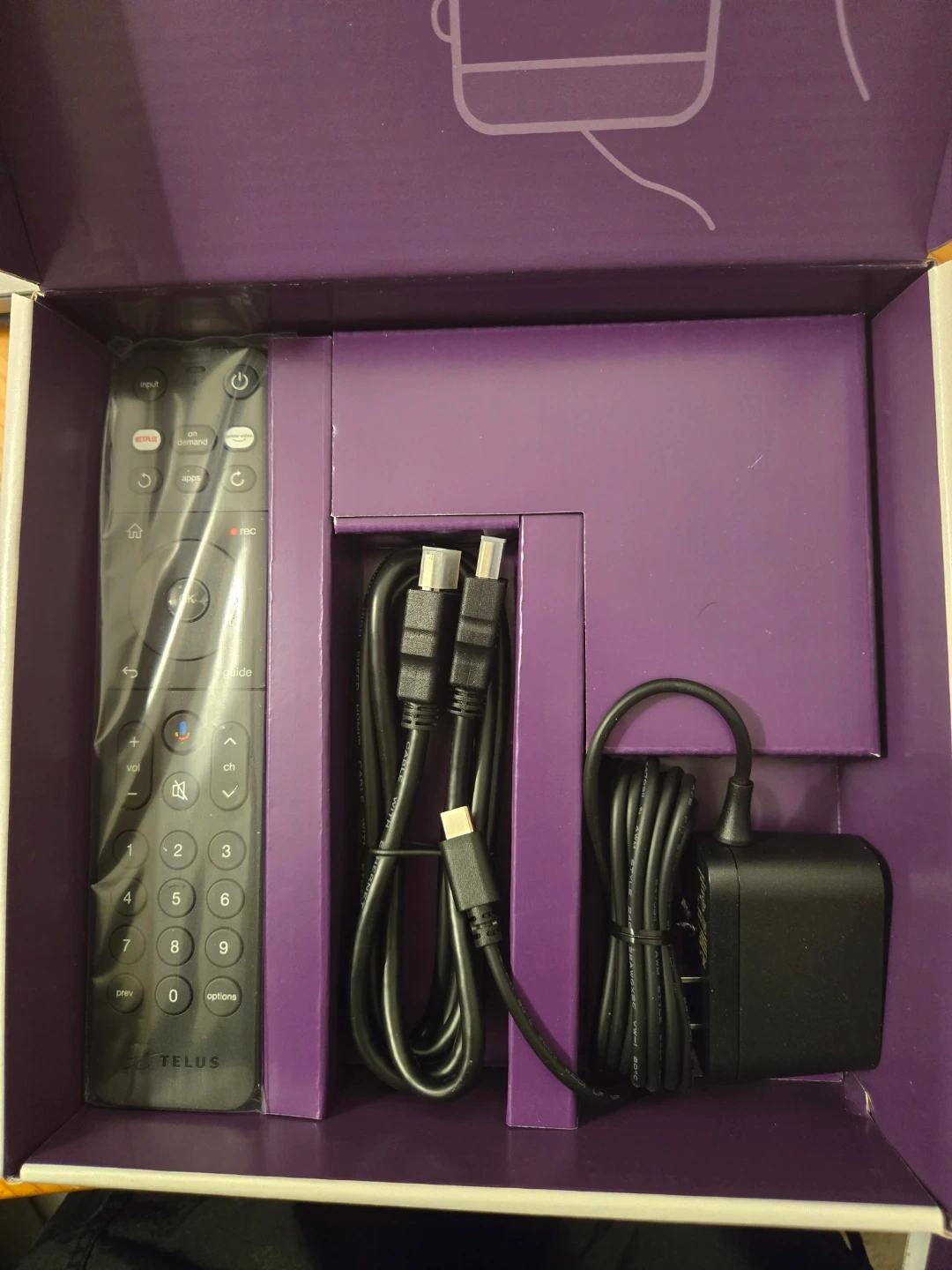 This is a TELUS TV digital box, it's a self-install kit. It comes with a remote control, power adapter, and HDMI cables. The box is in great condition, ready for your home entertainment setup!