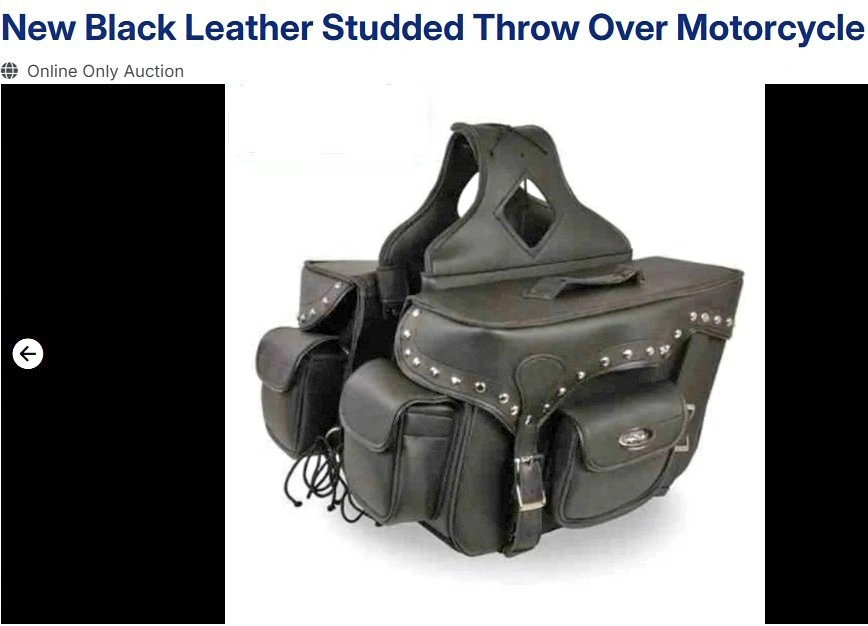 21New black leather studded throw over motorcycle saddle bags with tie up join & two Velcro pockets, set of 2 (left & right). Estimated MSRP: $340. Item condition: New. Package Dimensions: 68x58x44cm
