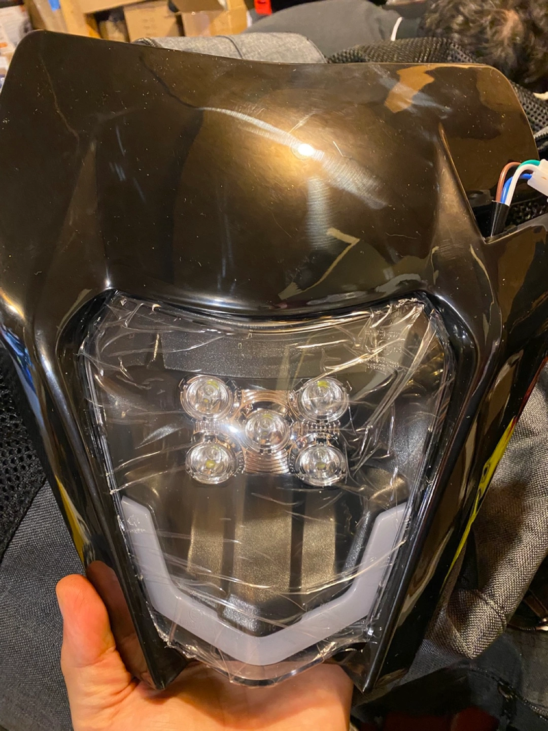 Here's a motorcycle headlight, still in its original packaging! It has a sleek black finish and a modern design with bright LED lights. Great for enhancing visibility and style on your ride