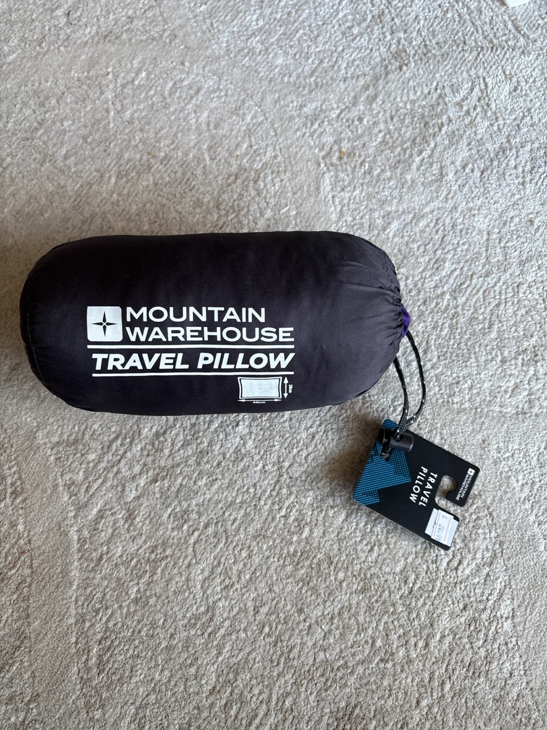 Selling a Mountain Warehouse travel pillow in black. It's in great condition and ready for your next adventure! The pillow measures 40cm x 25cm, making it compact and easy to pack. Perfect for travel or camping
