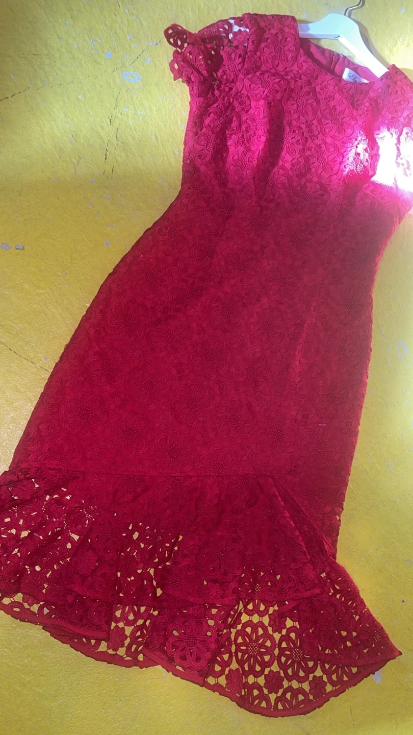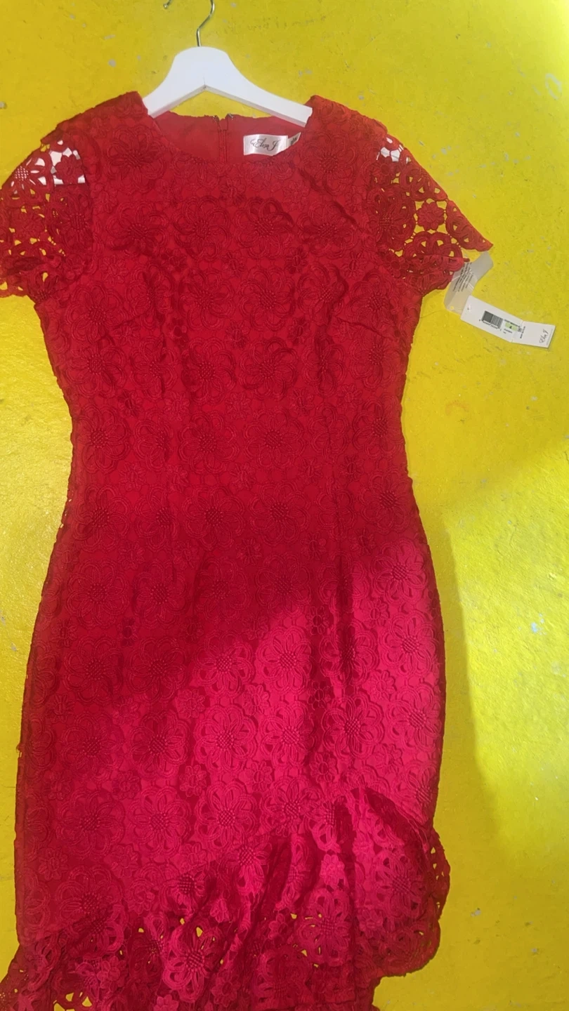 Gorgeous Eliza J red lace dress with a beautiful floral pattern. It features a flounce hem and short sleeves. Perfect for a special occasion!