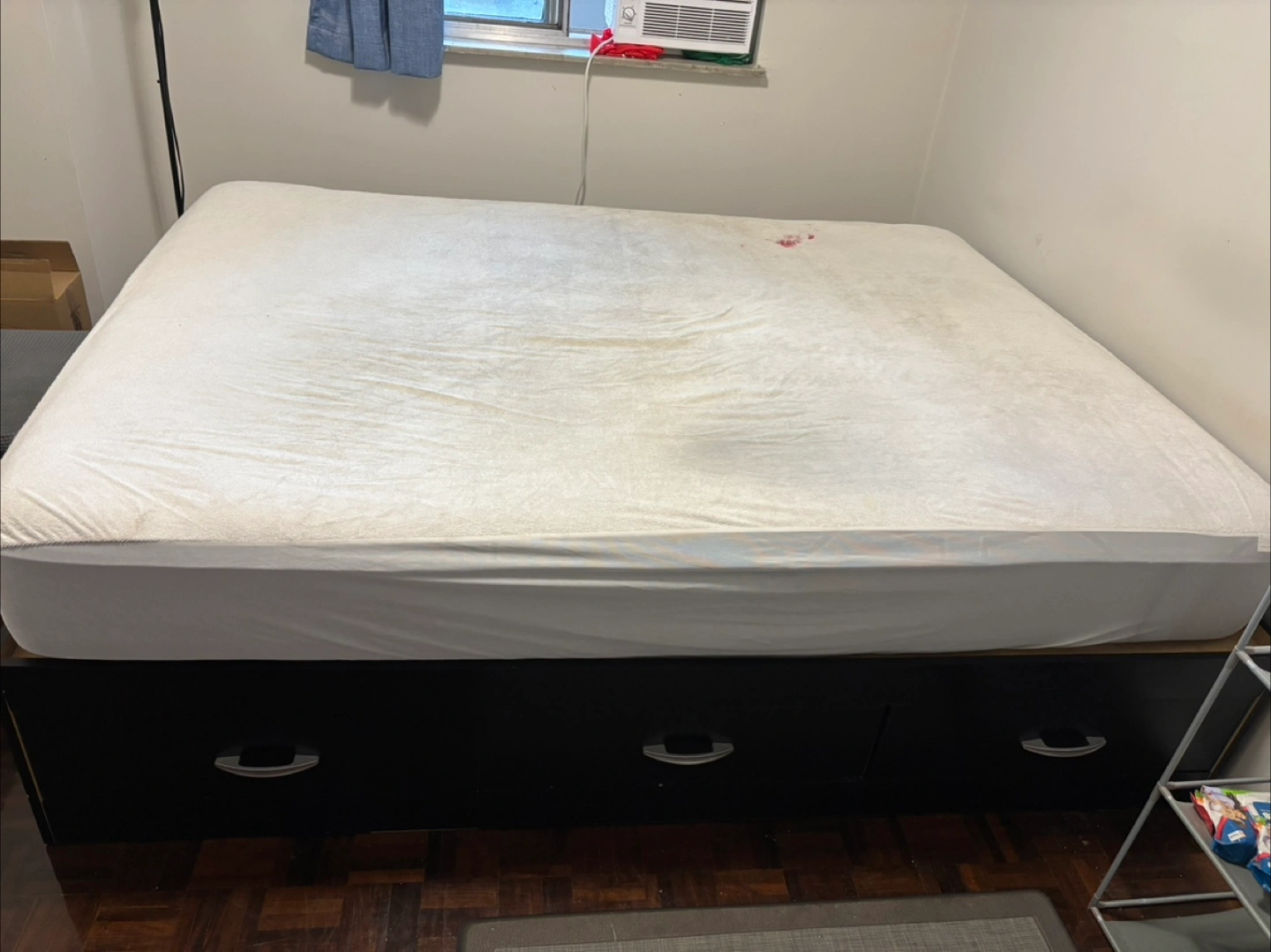 Selling this queen size bed with mattress with mattress white cover in urgent basis as I am moving out.