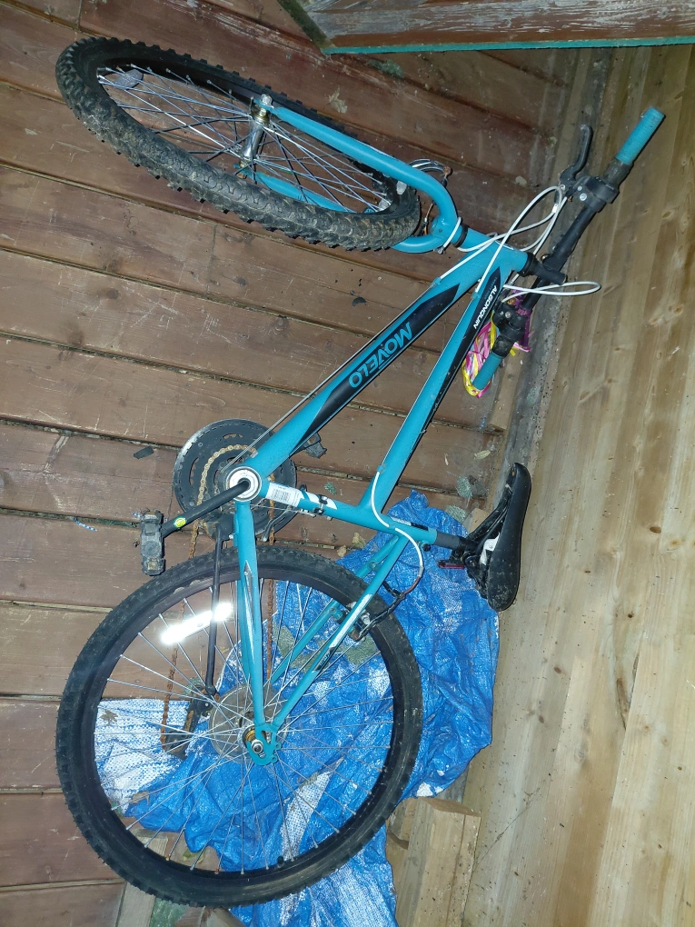 Selling a Movelo Algonquin mountain bike. It's got a sturdy frame and is ready for some off-road adventures. The tires are in good shape, and the bike is a nice turquoise colour. Perfect for someone looking for a reliable bike to explore the trails!
