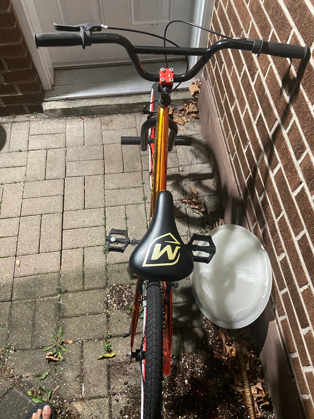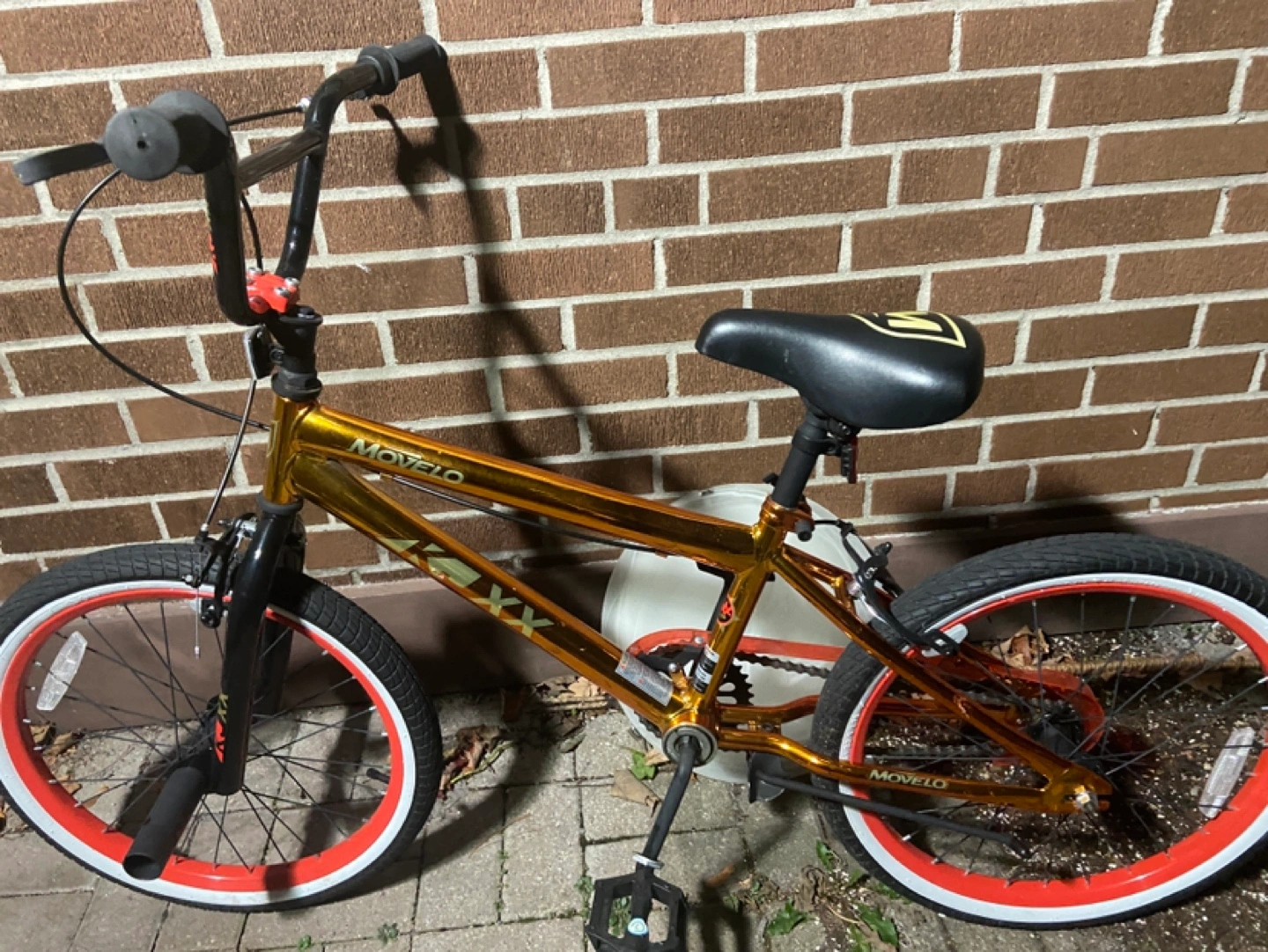 Gold and black BMX bike with red accents. Good condition. Not used at all . Suitable for short height , old people and for kids.