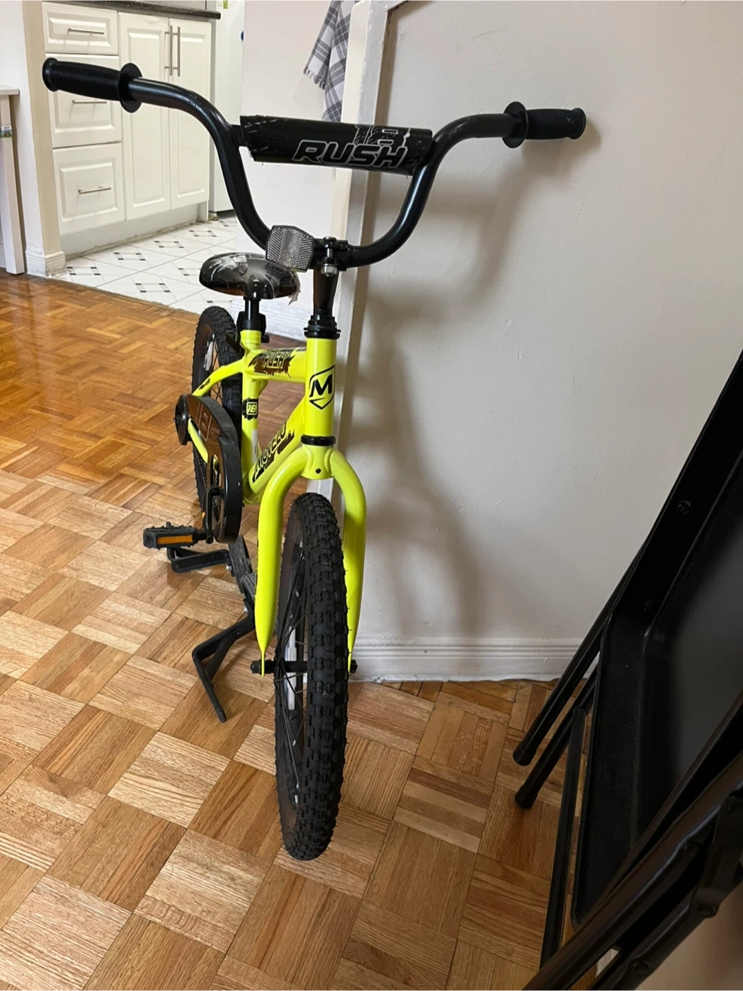 127Selling a Movelto Rush kids' bike in a vibrant neon yellow colour! It's an 18-inch bike that's perfect for learning to ride. Training wheels are included, so it's ready to go for your little one's adventures. Adjustable sheet height Barely used Looks like new Bought in $118+ tax