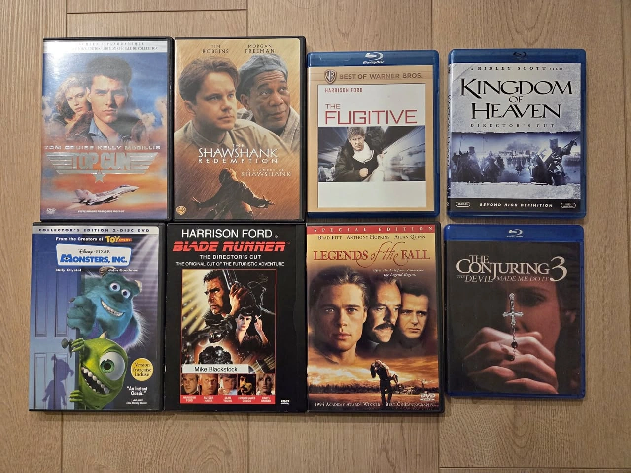 65$20 for all. Still available if listed: Top Gun (DVD) Shawshank Redemption (DVD) Monsters Inc (DVD) Blade Runner (DVD) Legends of the Fall (DVD) The Conjuring 3 (BD) Kingdom of Heaven (BD) The Fugitive (BD)