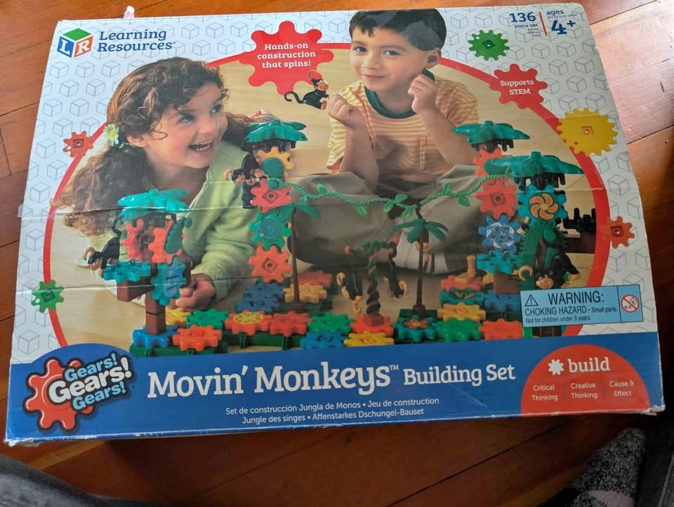 10Cog building set. 1 palm tree and 1 monkey missing. Similar to this https://www.staples.ca/products/1921072-en-learning-resources-gears-gears-gears-movin-monkeys-building-set