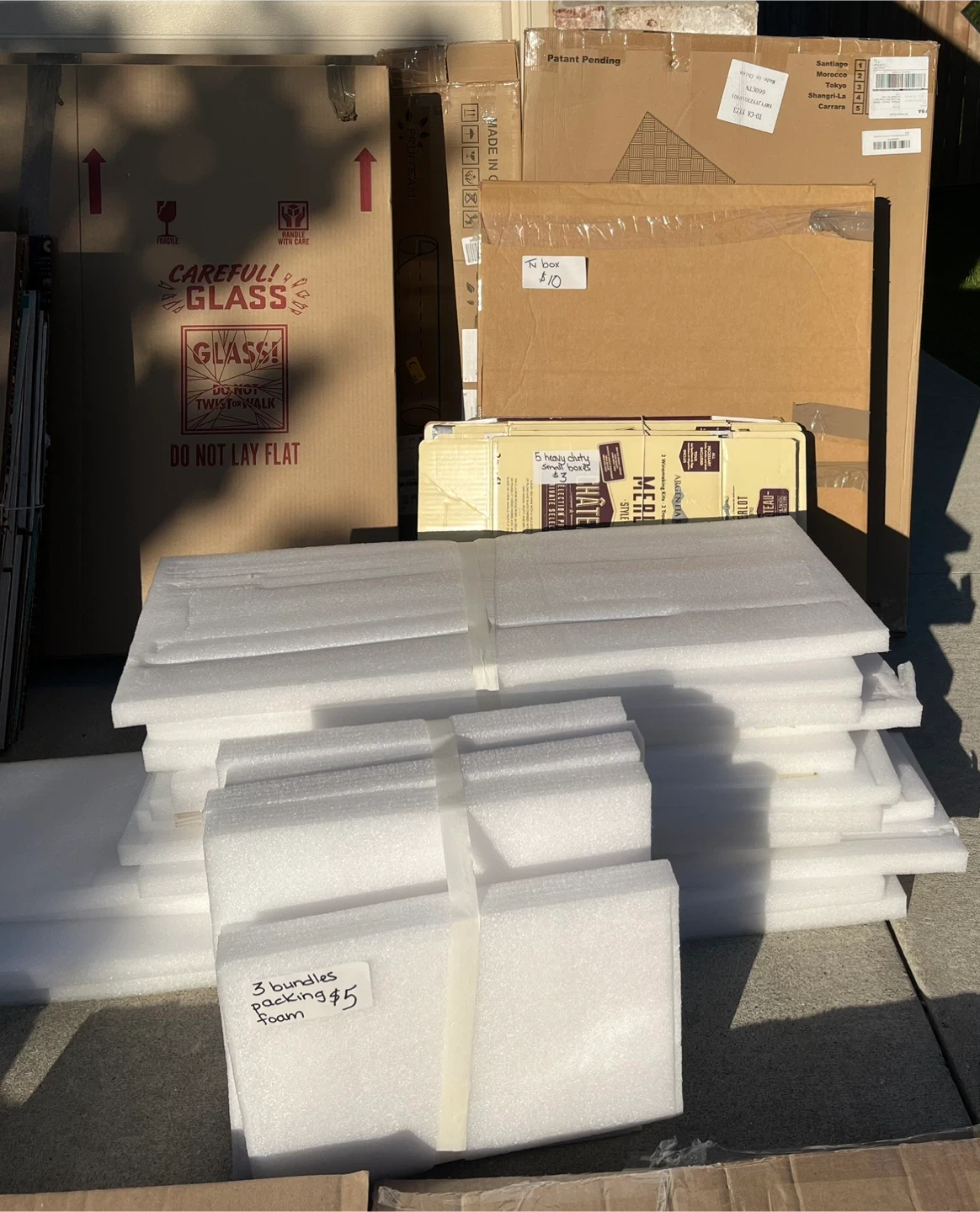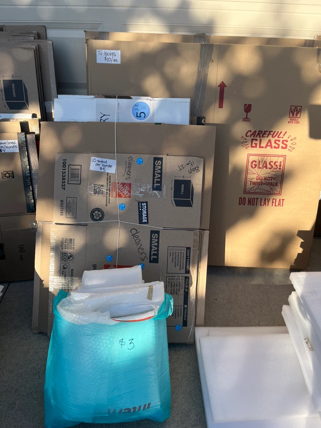 Everything you need to move. I have boxes - lots of shapes and sizes, packing paper and foam. $150 for the entire lot or: Home Depot Boxes: Extra Large- $1/ box Large- $7 per 5 box bundle Medium- $5 per 5 box bundle **dimensions detailed in photos Small misc. boxes- $3 per 10 piece bundle Small/ medium boxes- $4 per 10 piece bundle Medium boxes- $5 per 10 piece bundle 5 heavy duty wine boxes- $3 for the all Industrial bubble wrap- $10 per bundle (3 available) Aqua Bag of foam & wrap -$3 Packing paper - $5 per bundle (4 available) Packing foam $5 for 3 bundles (3 sizes) TV/ art/ mirror boxes - $10 each 2 measure approximately- 42”x 39” x 4” 1 measures approximately- 31”x 24.5”x 6.75” Please don’t msg to ask if it’s available. I will update the ad promptly as things sell.