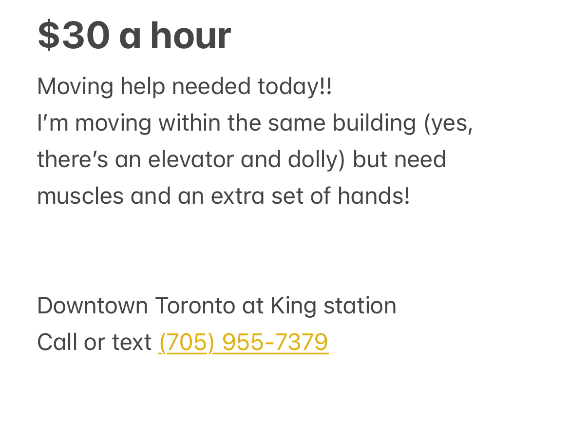 HomeBuy and sellMoving HelpTaylorOld Toronto28729 reviewsSoldMoving HelpWanted · $30I’m moving up a floor and my help fell through. I need one or two people for a few hours to help me move some furniture and boxes. $30 cash per hour! I have an elevator and dolly and just need muscles 💪Where to meetKing station1 chat·0 favourites·68 viewsGet the Karrot app