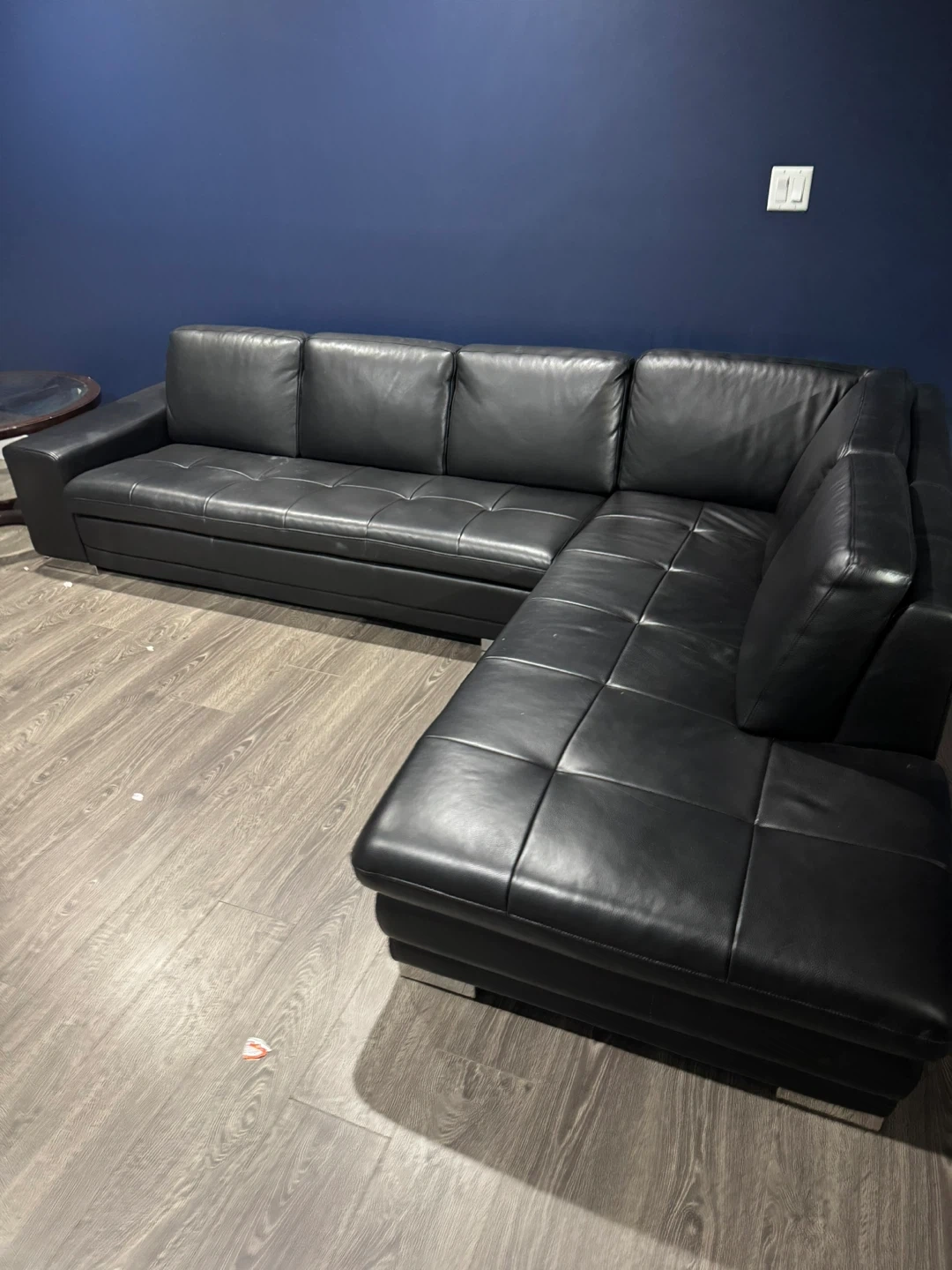 10Selling a new comfortable black leather sectional sofa. It's in good condition and would be a great addition to any living room! The material is leather and has a modern look.