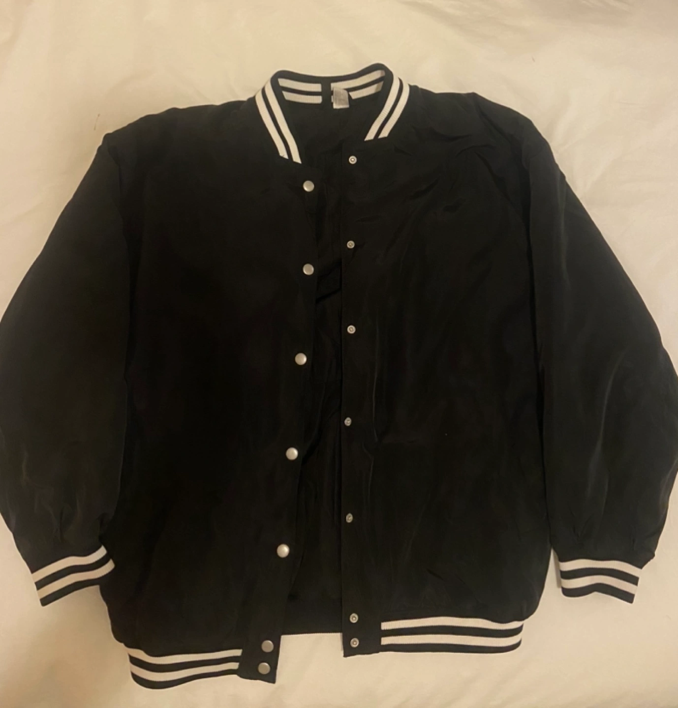 225Black varsity jacket with white stripes. Has snap buttons. 2 Pockets. Great for layering. It is a men's size S but can probably fit a women's size M.
